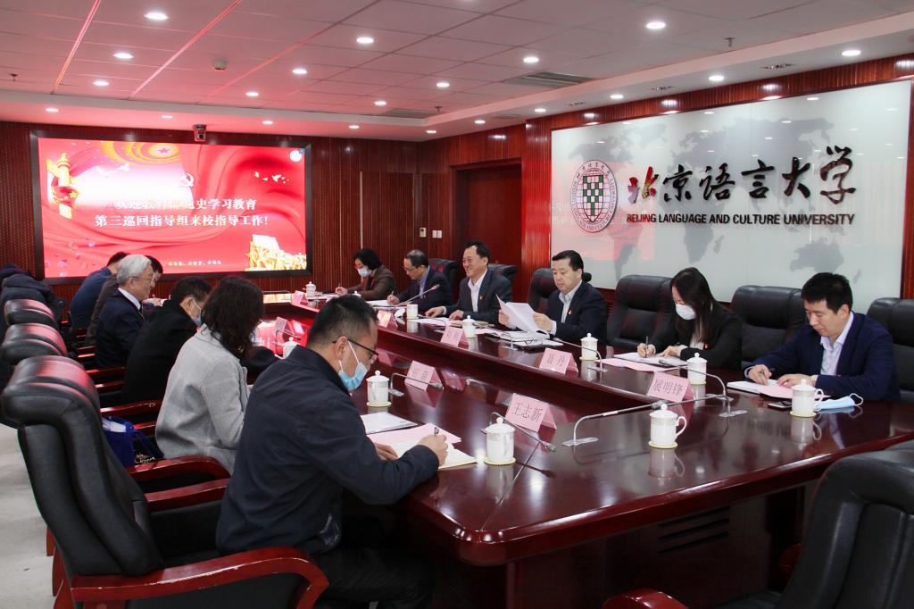 3月23日上午,教育部党史学习教育第三巡回指导组组长杨学义,副组长方国良、范迅,成员田萌、党宁、王志新莅临北语调研指导党史学习教育进展情况,并听取工作汇报。我校党委书记倪海东、校长刘利、党委副书记魏晖,学校党史学习教育领导小组各工作组组长参加会议。