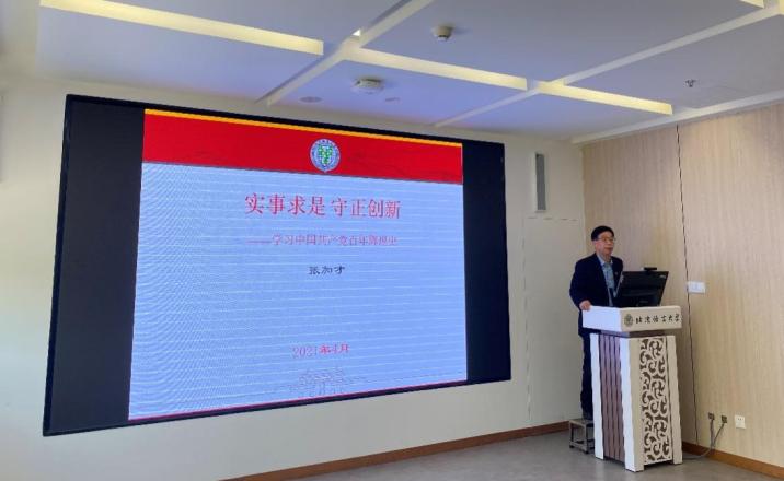 讲座中,张加才教授从“学习中共党史的背景、意义与要求”、“中国共产党百年创造的辉煌业绩”、“中国共产党百年辉煌的发展历程”、“中国共产党的理论创新的方法论”四个方面全面准确地阐述了学习中国共产党百年辉煌史的意义、重点和方法,以史论结合的方式深刻阐明了为什么学党史、学什么、怎么学的问题,讲座内容详实生动,既富于理论性,又通俗易懂,论述了新时代学习党的辉煌历史、弘扬党的辉煌业绩的重大意义。