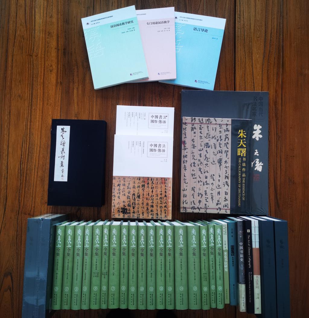 部分图书作品及校训“德行言语,敦睦天下”书法作品