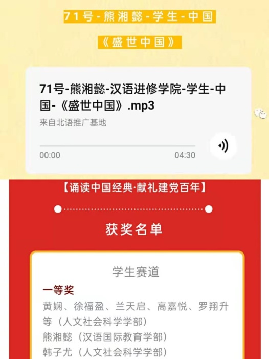 此外,部分支部同志还通过诵读现当代歌颂建党百年光辉历程和伟大成就的经典作品,如《无问西东》、《不忘初心、牢记使命》、《学史增信》等作品,以此抒发爱国爱党的真切情感,为党的百年华诞献上一份诚挚的敬礼。支部书记熊湘懿同志的作品《盛世中国》参与了北京语言大学举办的“诵读中国经典·献礼建党百年”的主题经典诵读活动并获得学生组一等奖的殊荣。他认为,经典芬芳历久弥新,经典名篇口口相传。朗读名篇不仅能够加强对红色经典的理解和感悟,更能激发传承红色基因的热情,培植家国情怀。
