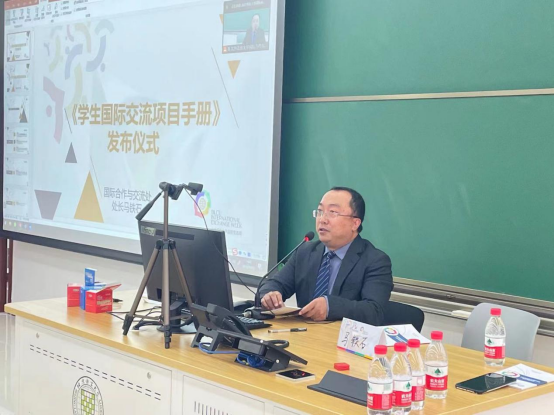 为响应新时代教育对外开放的政策,切实推进我校国际化建设,方便学生了解我校国际交流项目,由国际合作与交流处主持的 《学生国际交流项目手册》发布会及项目宣讲会与10月22日下午在教二楼201成功举办。此次发布会及宣讲会以线下活动+线上同步直播的方式举行。法国高等教育署北京中心王云祺、我校教务处处长王瑞烽老师、国际合作与交流处处长马铁石老师、各学院辅导员老师及同学们参加了本次活动。会议由国际合作与交流处老师主持。