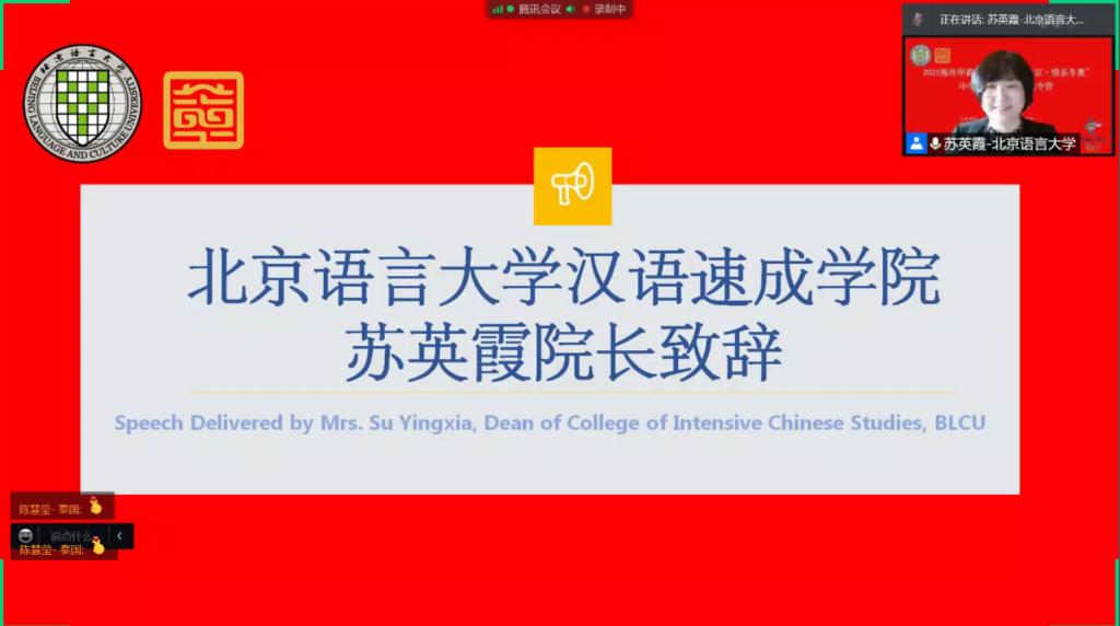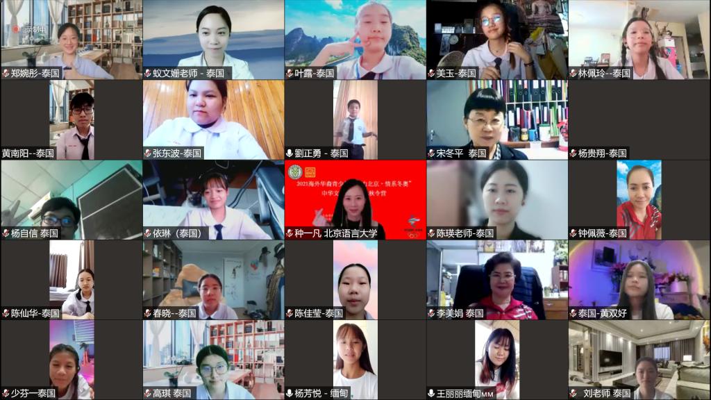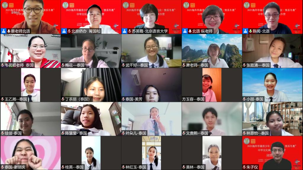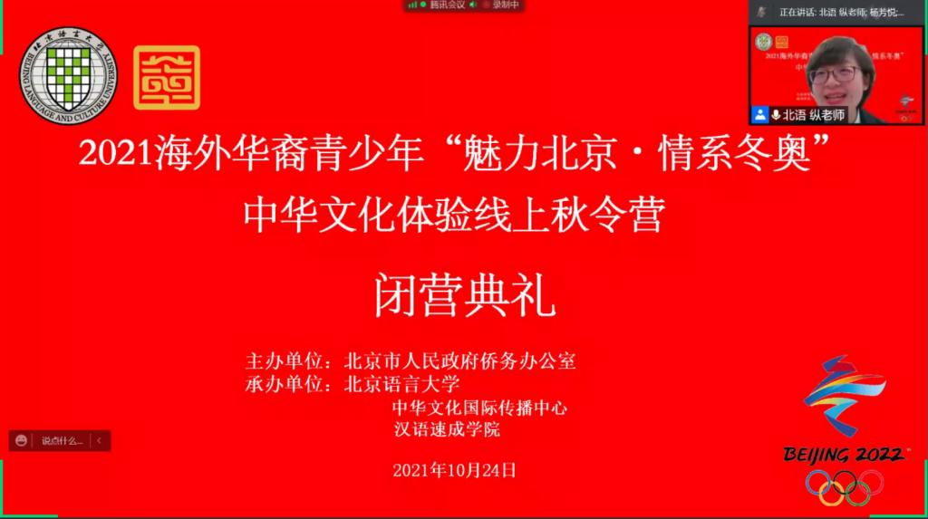 10月24日,为期10天的2021海外华裔青少年“魅力北京·情系冬奥”中华文化体验线上秋令营举行了隆重而热烈的在线闭营典礼。本期秋令营由北京市人民政府侨务办公室主办,北京语言大学中华文化国际传播中心和汉语速成学院共同承办。闭营典礼上,北京市人民政府侨务办公室副处长胥国和,北京语言大学汉语速成学院院长苏英霞、中华文化国际传播中心学术委员会副主任朱子仪、泰国代表处主任于美英以及中华文化国际传播中心的项目负责老师,还有来自泰国、缅甸、蒙古国的133名华裔青少年及领队齐聚云端,共同见证了秋令营的完美收官。闭营典礼由中华文化国际传播中心的项目主管纵璨主持。