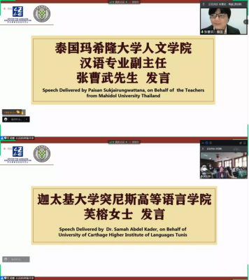 玛希隆大学人文学院汉语专业副主任张曹武博士和突尼斯教师代表芙榕博士先后讲话,他们都是北语的校友。他们都相信,通过这次研修,学员们将会收获更多的中文知识,更加深入地了解中国文化,提升汉语学习动机,提高汉语言运用能力。芙榕博士还深情回忆了她在母校的学习和生活。她一直以来都在关注母校举办的各种线上研修活动,而本次研修班的主题独具特色,内容丰富多样,日程安排科学合理、极富吸引力,正是汉语言专业学生迫切需要的课程。