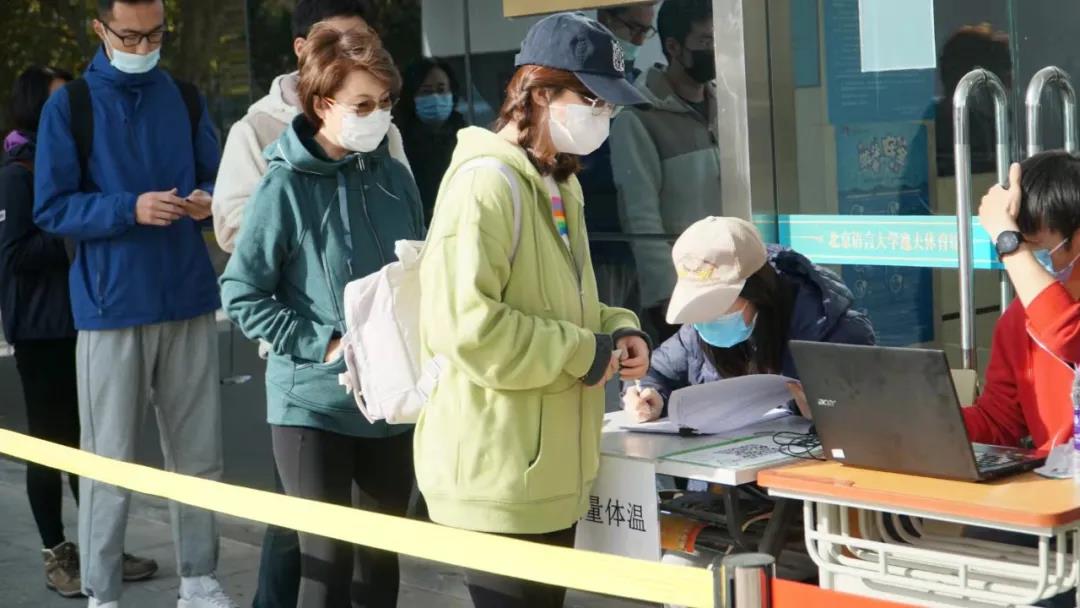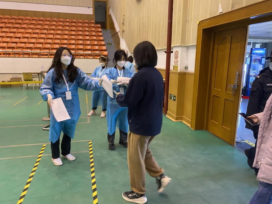 符合接种条件的师生,按照安排在逸夫馆南门集合,入口处体温检测和查验“北京健康宝”后,在保安们指导下有序排队进入接种点。