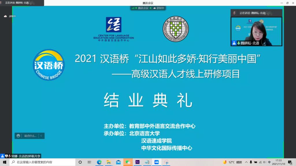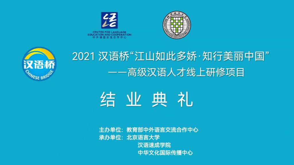 11月10日,由中外语言交流合作中心主办,北语汉语速成学院和中华文化国际传播中心联合承办的2021汉语桥“江山如此多娇·知行美丽中国”高级汉语人才线上研修项目举行了隆重的结业典礼。