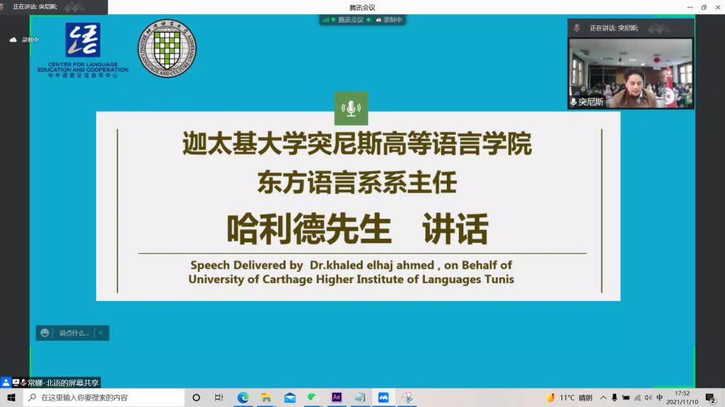 迦太基大学突尼斯高等语言学院东方语言系系主任哈利德在讲话中认为学员们在短短的10天里收获了众多优秀汉语教师的“知识速递”,研修班的课程既涉及中文的语言知识,也涵盖了中国文化的丰富内容,使学员们提升了中文运用能力,增加了对中国文化的感性认识,完全达到了此次线上项目的教学目的。他把北语看作是突尼斯高等语言学院汉语专业师生在中国的母校,他希望疫情能快点过去,他们能早日来北语访问和学习,期待北语在日后继续举办类似的汉语文化学习活动,进一步帮助突尼斯汉语学习者提高文化知识水平与语言运用能力。