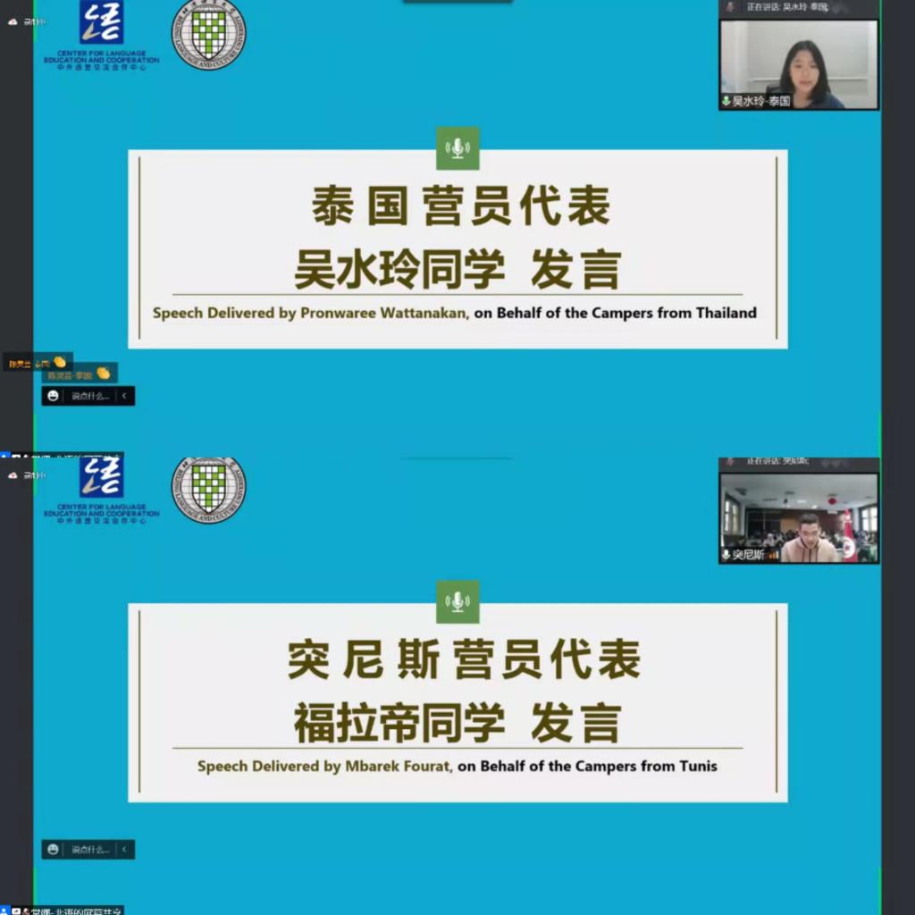 泰国营员代表吴水玲在讲话中说:“通过‘云游’的方式,我们切身感受到了中国文化的博大精深,也为中国取得的伟大成就而感慨,我的‘中国印象’变得更加真实和生动,我对中国的向往也更加强烈。这十天的课程让我们意犹未尽,我的同学们和我都有同样的想法,那就是早日去中国看看,去北京走走,去北语留学,和此次研修班的老师们‘再续师生缘’。”突尼斯营员代表福拉帝将这次研修班视为他们的“一次宝贵的学习机会”,“求学生涯中是一次美好而珍贵的回忆”。他说:“研修班的课程让我们深刻地了解伟大中国的方方面面,你们精彩的课程和丰富的内容,让我们对拥有五千年文化的中国更加向往”。他非常希望疫情过去后,就能到北语学习,同时领略中国的美丽河山。
