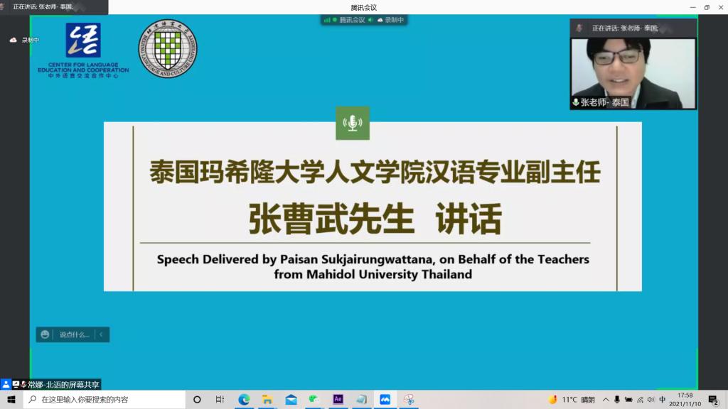 泰国玛希隆大学人文学院汉语专业副主任张曹武在讲话中称赞此次研修课程形式多样、内容丰富、主题鲜明、针对性强,将文化传播和语言教育完美融合,教学过程令人难忘,这“不仅仅是一场中国语言文化的云端之旅,更是一次文化和知识的盛宴,学员们徜徉在中华文化的海洋中,遨游在美丽中国的广阔土地上,亲身感受着汉语学习带给他们的无尽乐趣和无限可能。”
