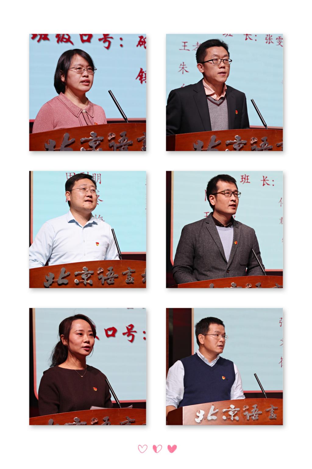 开班仪式上,“启航一期”班长杨天乔引导6个小班依次进行了班级展示。各班通过诗朗诵、唱班歌、书法展示、说唱表演等形式展示了班级的班名和口号,“奉献担当、和衷共济,致力强校、光耀中华”“砥砺品格、提高修养,锤炼本领、勇于担当”等铿锵口号,“培训宗旨要牢记,遵守纪律不能忘,带着问题进课堂,补齐短板才干长”“铁肩道义勇担当,时代重任肩上扛,青春风华逢盛世,拼搏奋斗正当时”等豪迈诗句充分展现了北语干部爱国爱校、锐意进取、昂扬奋进的精神风貌。
