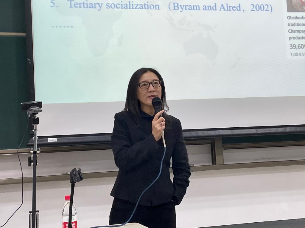 王丽虹教授围绕“跨文化交际”做主题报告。她强调在跨文化交际中的多重身份有利于扩大交际圈,应怀着真诚的态度与当地人交流,而非以为自身谋利为目的,并且向同学们介绍了一些人际交往技巧与注意事项。王丽虹还教授建议同学们,在交流过程中如果遇到困难,要及时记录自己与对方的反应,在此过程中不断学习,增强对不同文化的敏感度。