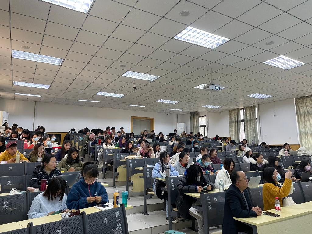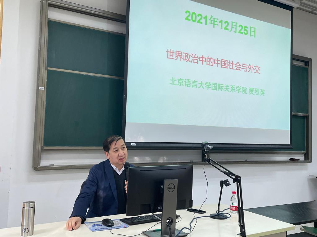贾烈英教授就“世界政治中的中国社会与外交”与同学们展开交流。贾烈英教授就中国的历史进程以及中国的外交工作进行了简述,介绍了当前中国经济与社会,通过今昔对比表现当今中国发展之迅速,介绍了近年来中国的几大热点话题。贾烈英教授还展示了北语近年来的发展情况,并介绍了北语的优秀校友,鼓励同学们留学期间发挥北语特色,肩负起中外交流的使命。
