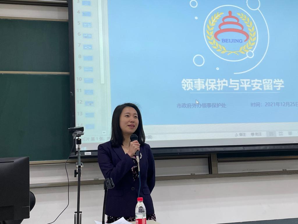 朱克诺女士以“海外领事保护”为主题作报告。介绍了领事保护的起源、内涵及分类,对实施领事保护的主体、方式、依据与对象等内容进行了科普。同时,朱克诺女士讲解了领事保护的四个基本原则,列举了中国公民海外留学常见的风险类型,并且向同学们介绍如何防范与应对风险。最后她还提醒同学们做好预防,掌握正确的保护方法,为自己的安全做好保障。