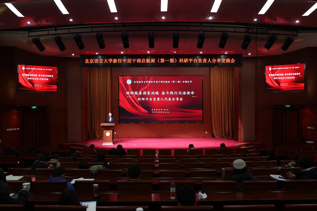12月24日下午,学校新任中层干部启航班(第一期)“科研服务国家战略 奋斗践行北语使命”科研平台负责人专题分享会在逸夫报告厅成功举办。这是启航班第7次培训会,也是第2次专题分享会。4位学校省部级以上平台负责人代表分享了服务国家战略的做法和成效。会议由党委常委、组织部部长聂丹主持。