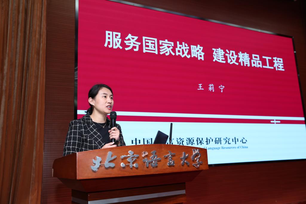 中国语言资源保护研究中心常务副主任王莉宁研究员以“服务国家战略需求,建设精品语言工程”为题进行分享。她讲述了语保中心在国家重大语言文化项目“中国语言资源保护工程”一期建设中做出的重要贡献,即制定语保工作规范标准、开展语言资源调查保护、推动学科建设和人才培养以及开发语言资源应用产品等,引领全国350多所高校和科研机构、1000多个专家团队、4500多名专业技术人员,在保护方言和少数民族语言资源、传承中华优秀语言文化方面发挥了重要作用。此外,她还分享了语保中心二期建设的构想。