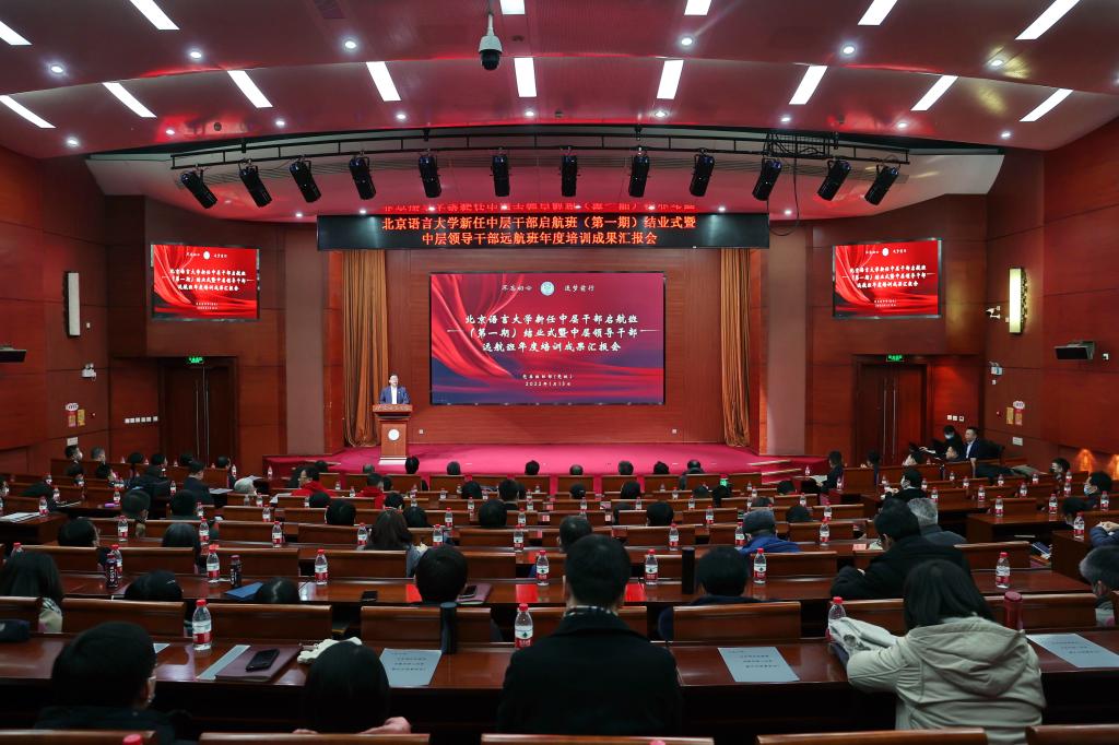为更好展示中层领导干部教育培训成果,及时总结干部教育培训工作经验,1月13日,北京语言大学举办新任中层干部启航班(第一期)结业式暨中层领导干部远航班年度培训成果汇报会。校党委书记倪海东出席并讲话,校长刘利主持会议。学校领导班子全体成员出席了会议,启航班(第一期)及远航班176位中层干部在会上对一年来的教育培训成果进行了精彩展示。