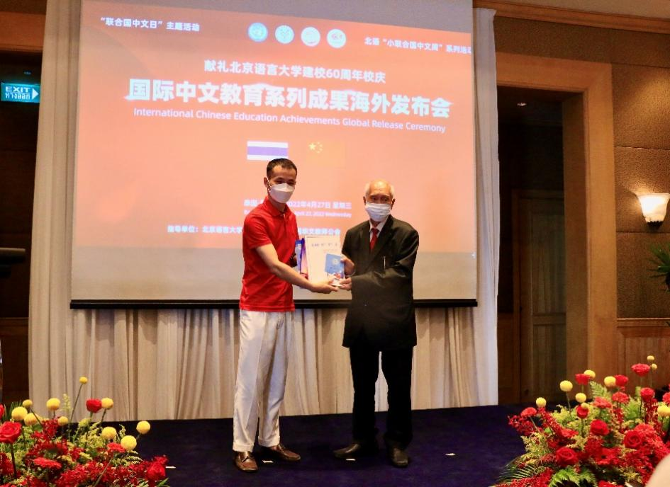 发布会后,北京语言大学与中泰教育企业代表共同向泰国广大学校和教育机构捐赠了“国际中文教育系列成果”中的书刊。泰国华文教师公会作为受赠代表和接收单位,将把获赠书刊转送到泰国多所中小学和大学,帮助学校师生学习中文,了解中国。