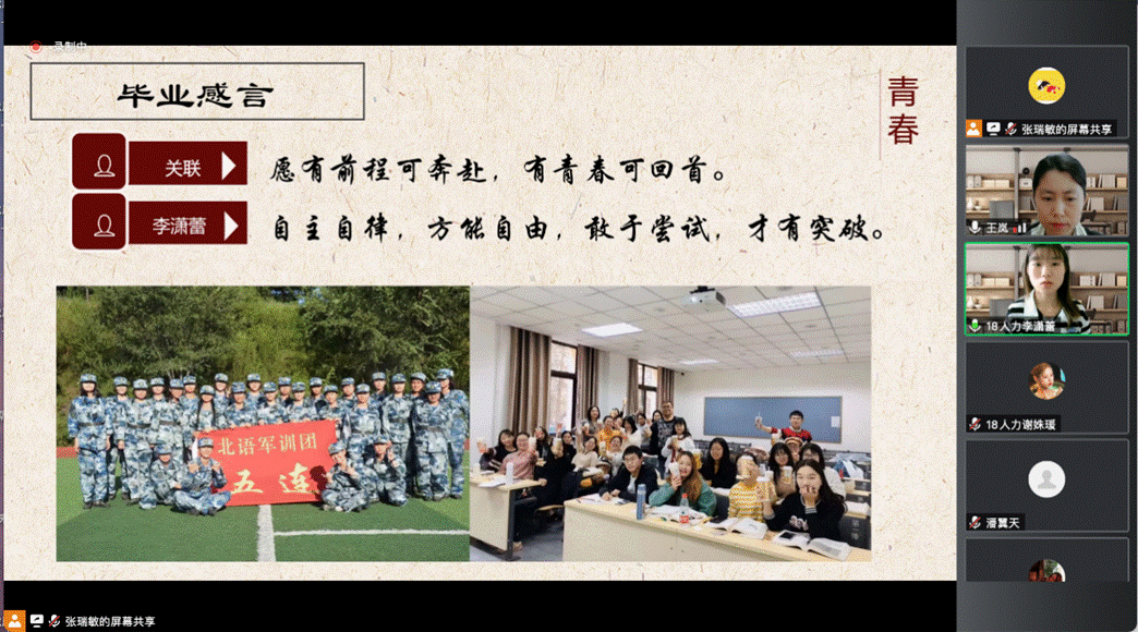 黄益方副校长在线上对同学们致以亲切问候,回忆了四年间参加人力班班会的美好时光。结合班会主题,黄益方副校长指出,习近平总书记在庆祝中国共产主义青年团成立100周年大会上发表重要讲话,对团员青年提出明确要求,寄予殷切希望。青春当奋斗,黄益方副校长希望同学们能深入领会总书记讲话精神,刻苦学习,积极实践,成为德智体美劳全面发展的时代新人。基于同学们的专业实际,黄益方副校长结合自身多年从事管理工作的丰富经验,与同学们分享了做好管理工作的四个要素:一是理念先行,遇事多思考多琢磨,明确目标、方法、定位,再采取行动。二是投入到位,全面了解情况,掌握信息,为个人决策奠定坚实基础。三是方法得当,管理工作既是科学也是艺术,要讲究方法,顺应规律,方能事半功倍。四是能力胜任,实力决定一切,要在政治素质、道德品格、管理能力和心理素质方面做全面锻炼。对于未来,黄益方副校长对全班同学寄予希望:希望同学们始终看到生活中的光,坚定理想追求,保持积极乐观的精神,努力奋斗;希望同学们始终在选择正确目标后坚持到底,不轻言放弃,在坚持中不断提高突破自我,实现梦想;希望同学们始终做到理性平和,学会管理自己的情绪,理性看待问题,保持平和心态。