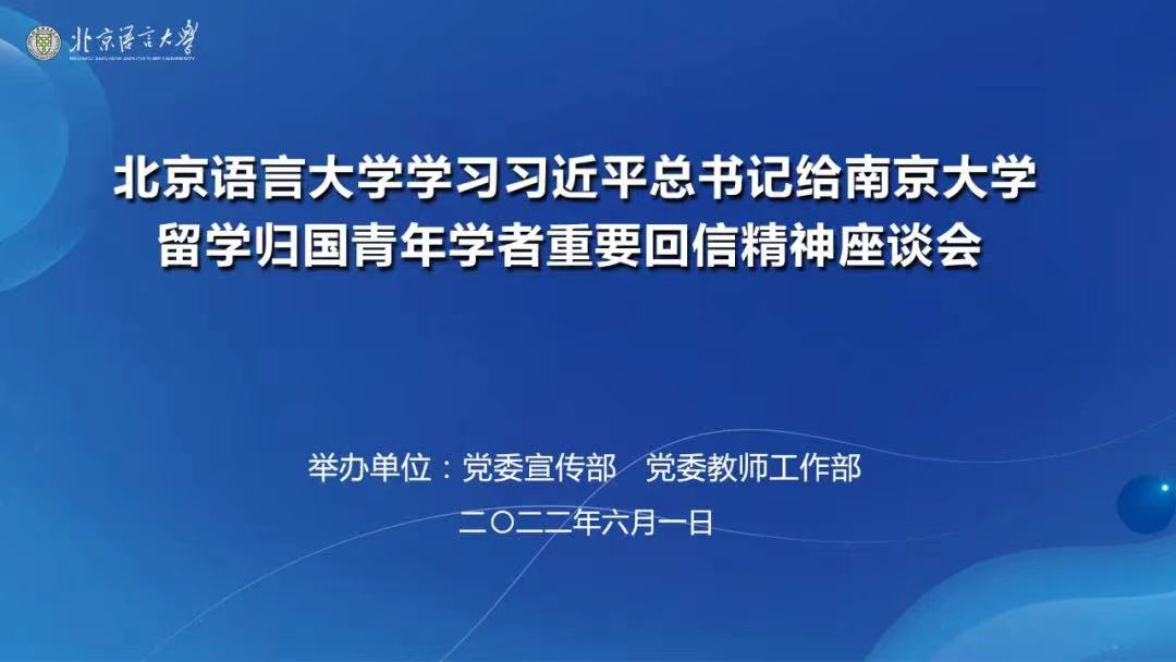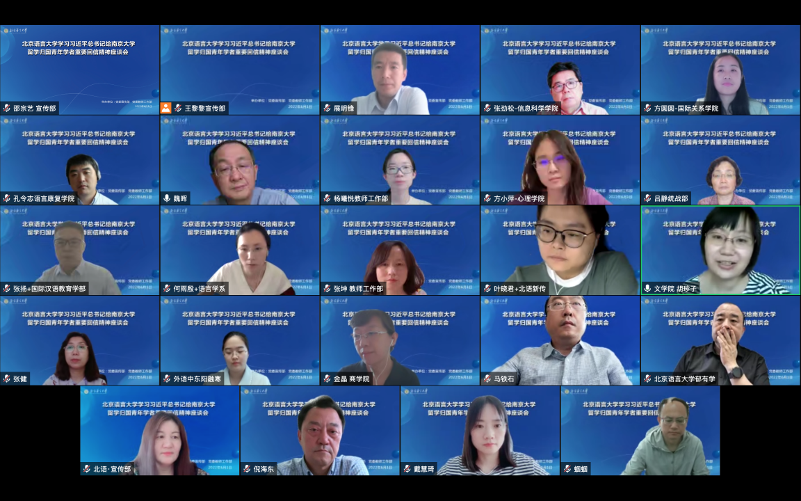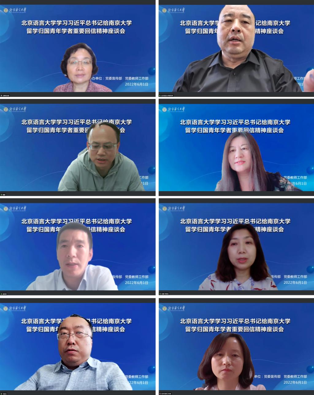 6月1日下午,北语召开学习习近平总书记给南京大学留学归国青年学者重要回信精神线上座谈会。留学归国教师代表和相关职能部门负责人参会,党委书记倪海东出席会议并讲话,会议由党委副书记魏晖主持。