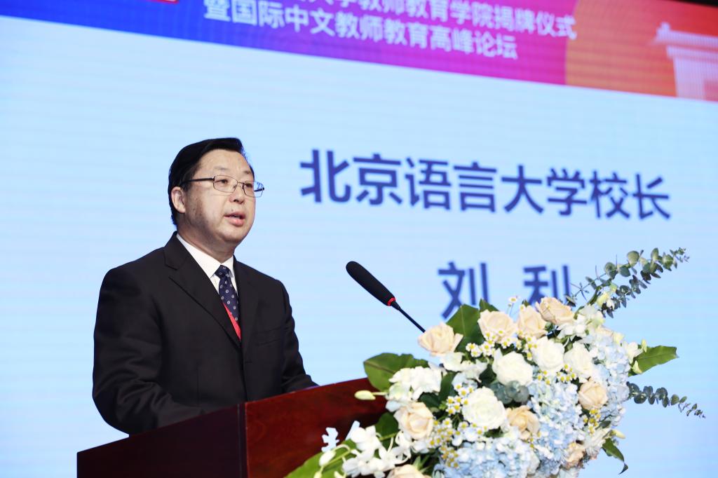 刘利校长在欢迎辞中指出,北京语言大学是我国高校中以开展国际中文教育为主要特色和优势的多科性国际型大学,培养学习中文与中华文化的留学生和从事中文教育的教师,是国家赋予这所大学的两个重要使命。今年适逢北京语言大学建校60周年。60年来,北语着眼于服务国家外交大局,积极探索学科专业发展之路,大力推进教育教学改革,为我国的国际中文教育事业发展做出了历史性贡献。为适应新时代国际中文教育事业发展的需求,更好地培养卓越中文教师,学校决定整合全校教育教学资源组建教师教育学院。经过广泛调研、深入论证和精心实施,学院已于2020年12月正式宣告成立。组建教师教育学院既是学校因应新时代教师教育需求的重要举措,也是学校国际中文教育专业内涵发展的必然结果。北京语言大学的中文教师教育有着深厚的历史传统和突出的育人成绩,这为教师教育学院的建立奠定了坚实的基础。教师教育学院的成立是学校发展历程中的一件大事,标志着我校国际中文教育的学科专业建设由此开启了新征程。当前国际中文教育正处于历史机遇和挑战并存的特殊时期,一方面党和国家对国际中文教育师资队伍建设寄予厚望,全球中文学习者的不断增多对教师的需求量也在日益加大。但同时要看到,我们在中文教师培养方面,从学科体系构建、专业内涵建设到教育教学实践,都还存在着许多亟待解决的理论问题和操作层面的短板。因此,北京语言大学成立教师教育学院,决不是简单的学院更名和牌子替换,而是深化教师教育改革、推动教师教育科学化的必然之举,是强化学校办学特色、巩固办学优势的必然之举。一是明确中文教师培养的“师范性”,推动中文教师的培养范式与世界通行的“师范教育”接轨,从而提升国际中文教师教育的专业化水准。二是推动中文教师教育的基础理论研究和专业内涵建设,将教育学的一般原理与中文教师培养的实际相结合,形成具有国际中文教育特色的教师教育理论,为专业内涵建设和育人实践提供理论支撑。三是深化中文教师教育模式改革,推动中外学生一体化培养,本硕博三个学历层次贯通培养,利用基地扩大选才进行拨尖培养,着力造就卓越中文教师和未来教育家。为此,当前和今后教师教育学院应着力加强四大体系建设。第一,着力构建国际中文教师教育的学科体系。第二,着力构建本硕博一体设计、每个层次各有专业侧重的中文教师培养体系。第三,着力构建适应多元化教育需求的课程体系。第四,着力构建国际中文教师的培养标准和评价体系。刘利校长希望教师教育学院以此次揭牌为新起点,发扬优良传统,加强顶层设计,完善发展规划,汇聚高水平人才,勇于探索,勇于创新,推动学院建设和教师教育事业向着高起点、高质量的目标前行,不断为国际中文教师教育贡献新理论、新方案和新经验,为培养造就更多德才兼备的卓越中文教师和教育人才,推动国际中文教育事业高质量发展做出新的更大贡献!