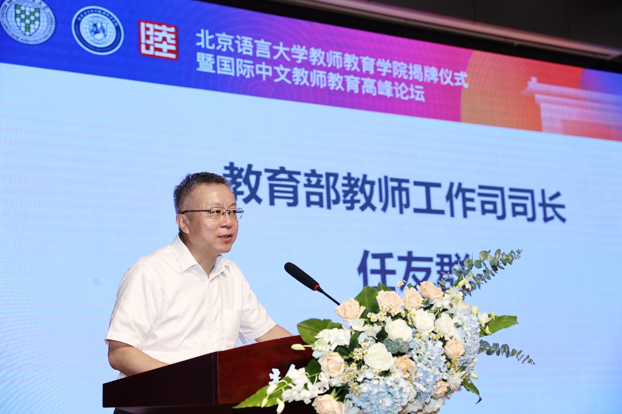 7月2日,北京语言大学教师教育学院揭牌仪式暨国际中文教师教育高峰论坛在教一楼209报告厅隆重举行,这是国际中文教育领域的国内首家教师教育学院。教育部教师工作司司长任友群,中国国际中文教育基金会副理事长兼秘书长赵灵山,首都师范大学党委书记孟繁华,北京语言大学校长刘利等出席揭牌仪式。揭牌仪式由北京语言大学党委副书记魏晖主持。