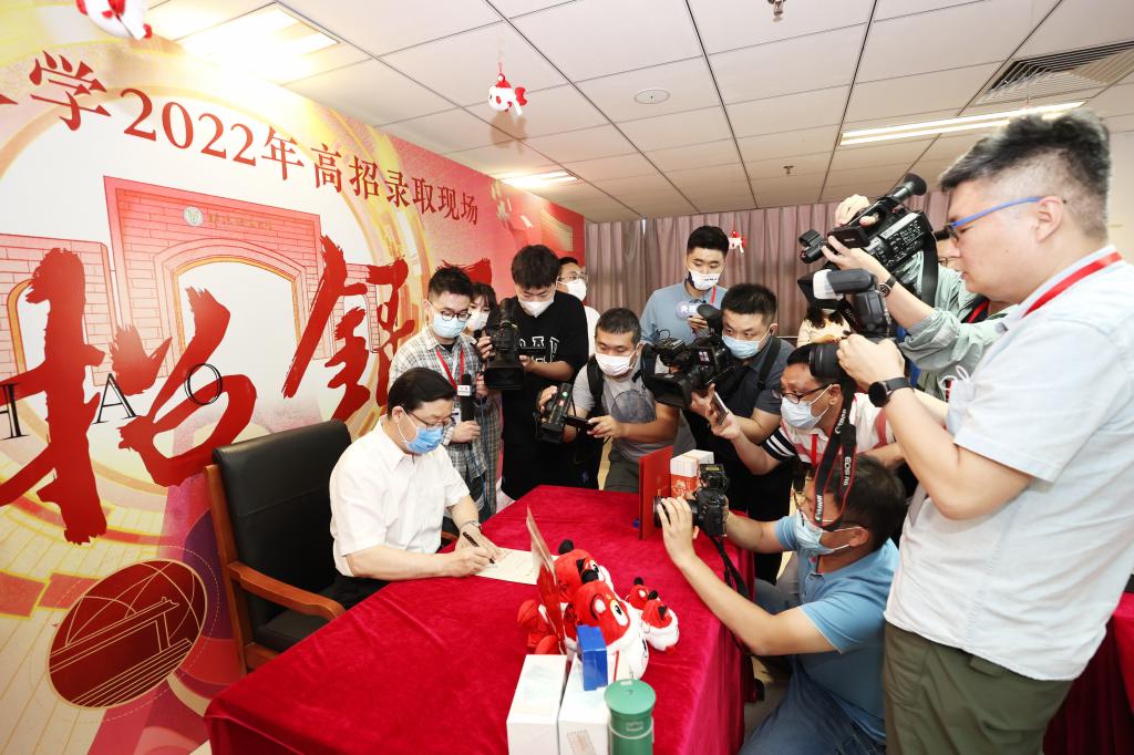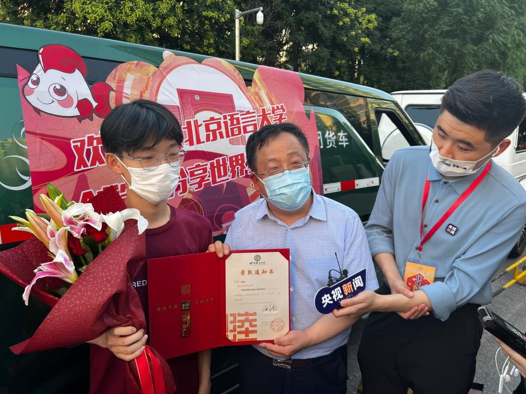 下午,北京市第一封普招录取通知书由工作人员现场打印,交由北京语言大学校长刘利亲笔签名盖章。北京语言大学外国语学部党委书记罗林和中国邮政EMS工作人员一起为学生递送录取通知书。