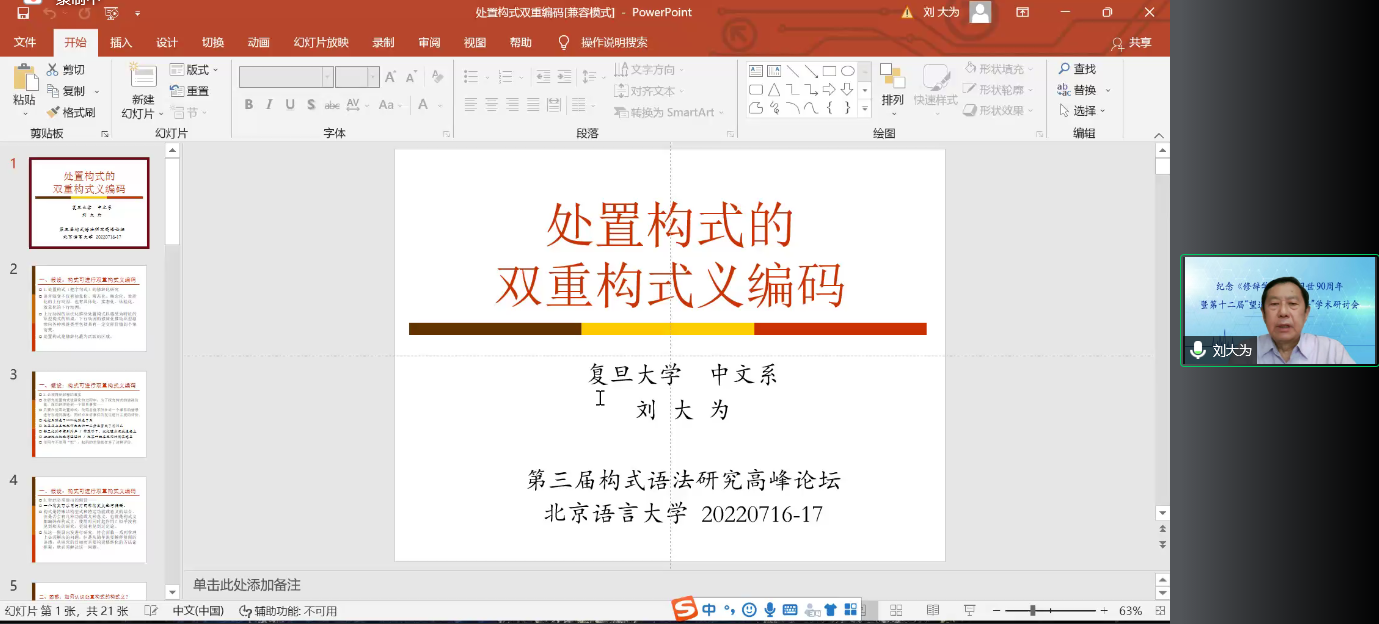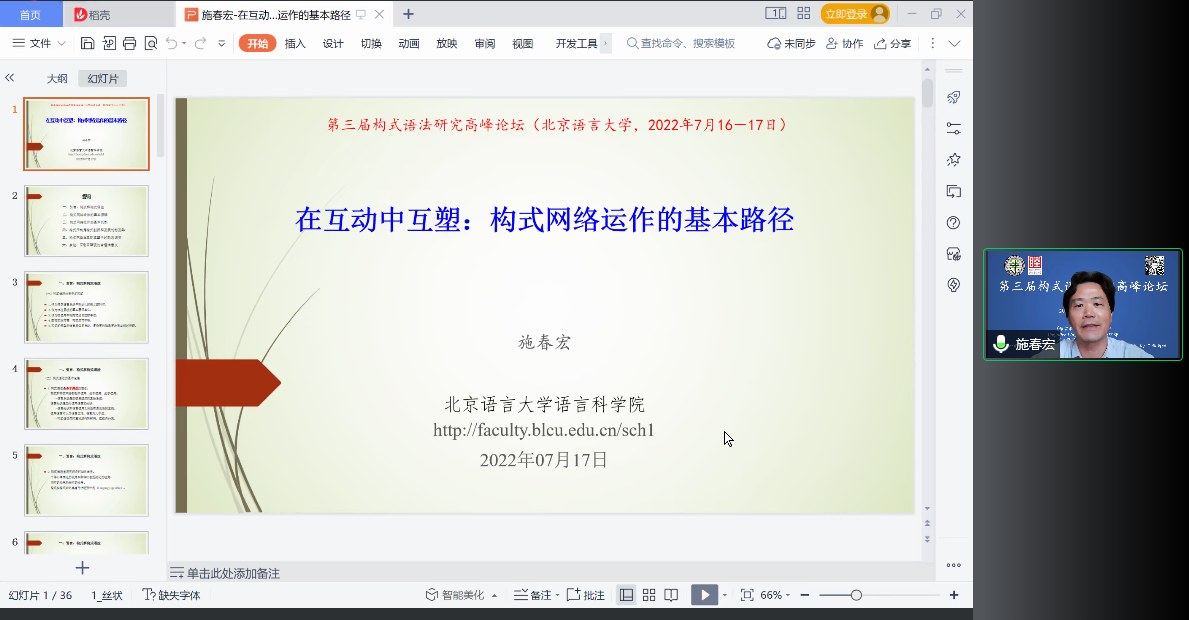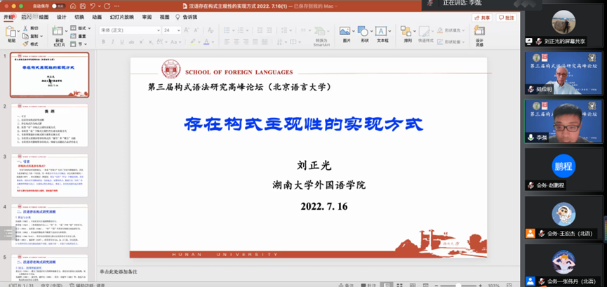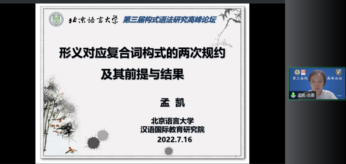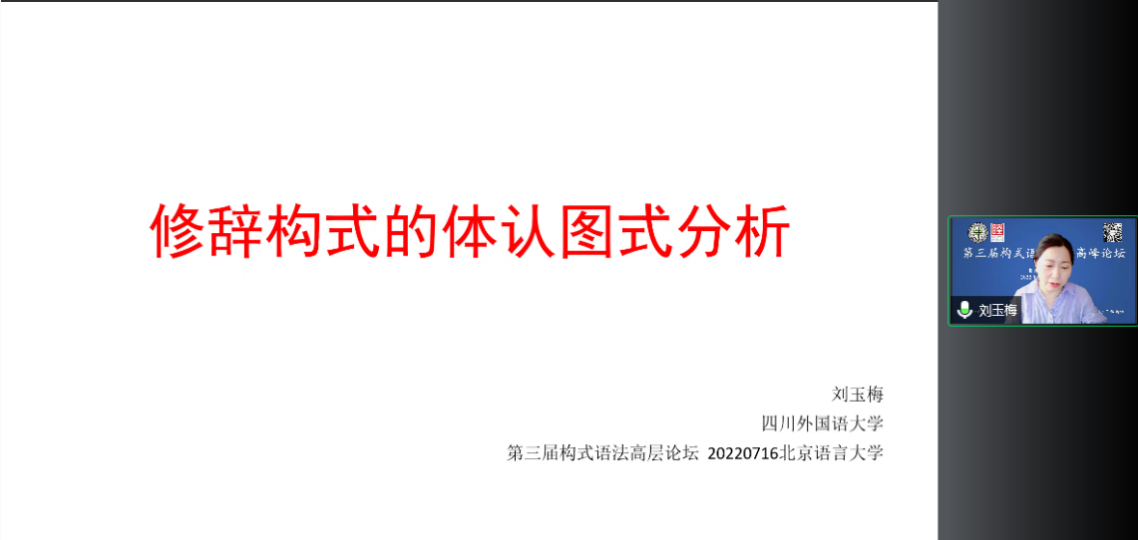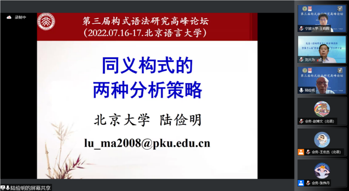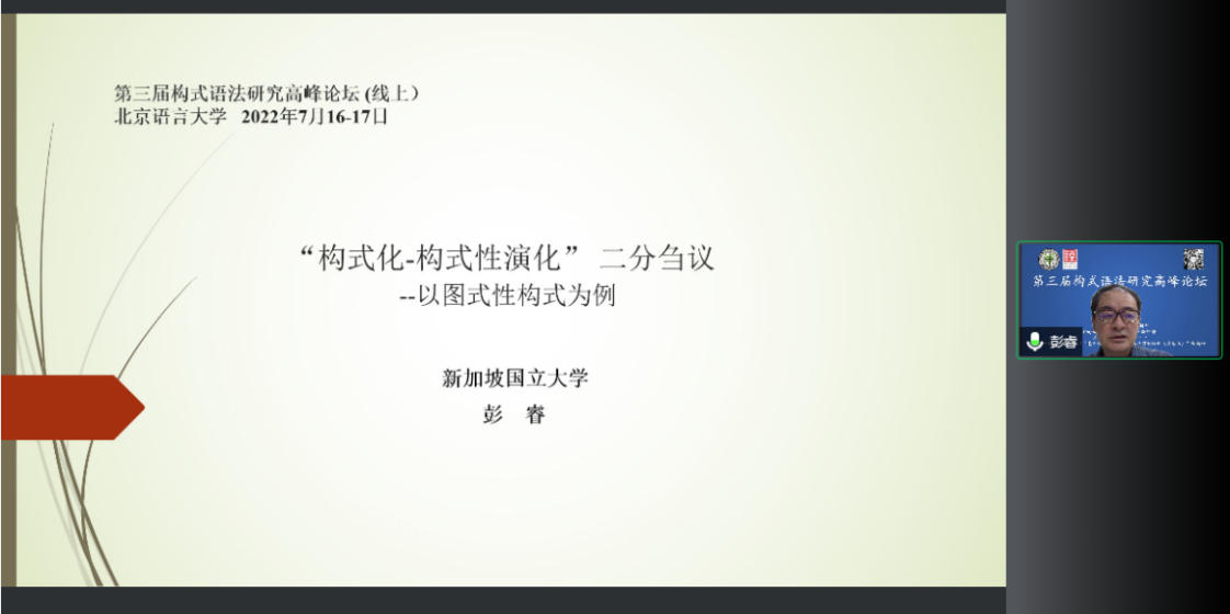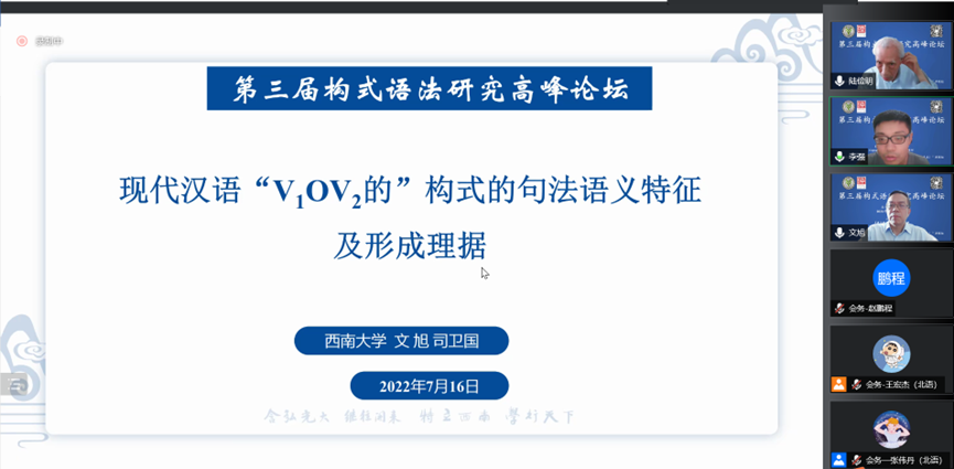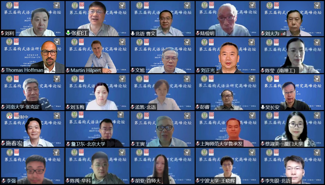 “第三届构式语法研究高峰论坛”于2022年7月16日至17日在北京语言大学成功举办。本次论坛由北京语言大学《语言教学与研究》编辑部、Cognitive Linguistic Studies编辑部、语言资源高精尖创新中心共同举办,依托国家社科基金重大项目“基于汉语特征的多元语法理论探索(多卷本)”,以“构式语法的前沿探索和理论交融”为主题,特邀国内外多领域、多学科的十五位构式语法研究领域的著名学者进行主旨报告。论坛通过腾讯会议和Bilibili直播的方式进行,线上吸引了国内外两千余名师生参与。