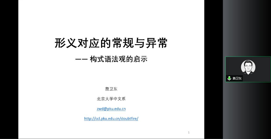 开幕式后,论坛进入主旨报告阶段。陆俭明、刘大为、Thomas Hoffmann、Martin Hilpert、文旭、刘正光、陈莹、张克定、刘玉梅、孟凯、彭睿、吴长安、施春宏、詹卫东、王寅等15位国内外专家先后做主旨报告,涵盖共时与历时、本体与应用、汉语与外语等多个领域、多个学科。围绕“构式语法的前沿探索和理论交融”的主题,各位专家分别就构式语法的理论建设、方法反思、个案分析、应用探索以及构式语法与其他学科的交叉融合等诸多前沿论题展开了深入交流,并引发了线上师生的热烈讨论。