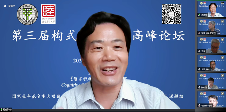 施春宏教授首先代表《语言教学与研究》编辑部和语言资源高精尖创新中心向莅临本届云论坛的各位领导和专家表示衷心的感谢,向通过视频方式参与论坛的广大朋友表示热烈的欢迎。施教授指出,近年来构式语法研究范式受到国内外学界的广泛关注,在理论探索和应用分析中都取得了显著的实绩,同时呈现出新的发展态势,召开本次论坛有助于反映构式语法研究的焦点问题和最新进展,促进构式语法研究的深入交流。同时,施教授向大家汇报了《语言教学与研究》近些年一直关注语言科学研究的前沿问题、热点问题、重大的理论和实践问题,近些年特别关注语言学研究及相关应用研究的新观念、新理论、新方法、新领域、新学科的生长过程和实践活动。最后希望通过举办本次论坛,进一步推动语言学研究的前沿探索和理论交融。