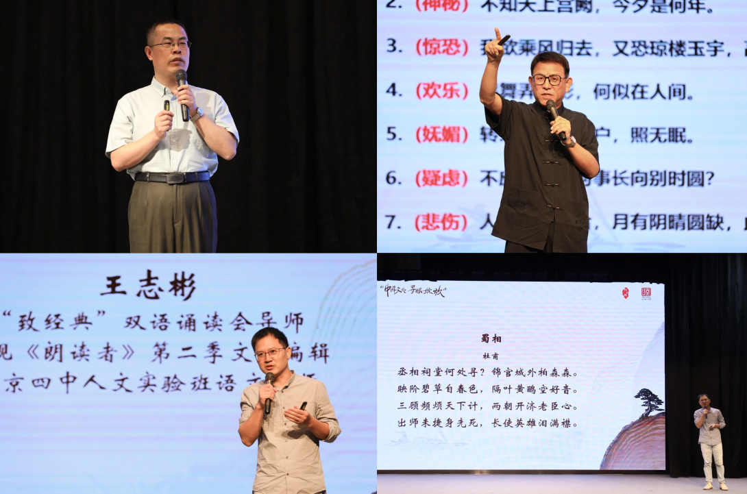 在“出彩讲堂”环节中,北京语言大学教授王秋生、中华儿童文化艺术促进会戏剧教育专业委员会副主任李洪涛及北京四中人文实验班语文教师王志彬三位“致经典”双语诵读会导师围绕中西方经典诗歌的不同切面带来了三堂生动精彩的公益课。