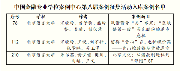 近日,全国金融专业学位研究生教育指导委员会(金融教指委)下达《关于中国金融专业学位案例中心第八届(2022年)案例征集活动结果的通知》(金融教指委字〔2022〕04号),商学院宋晓玲教授、朱尔茜教授与2021级金融专硕研究生共同撰写的三篇案例《风萧萧兮“易”水寒:“区块链第一股”易见股份的退市危机》《留得“青山”在,也怕镍价高——青山控股镍期货被逼空》《北京文化:从爆款制造机到“带帽”ST》达到中国金融专业学位案例中心入库标准,将纳入中国金融专业学位案例中心。