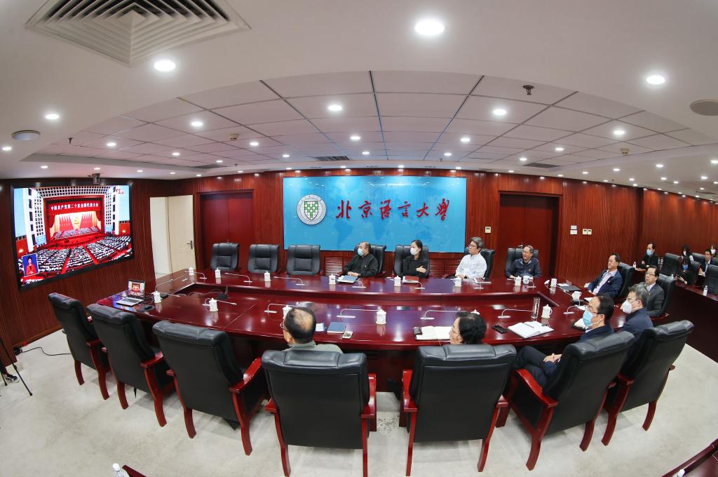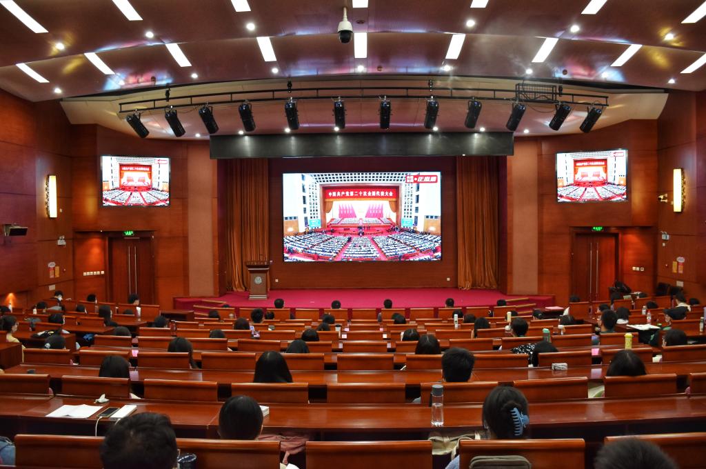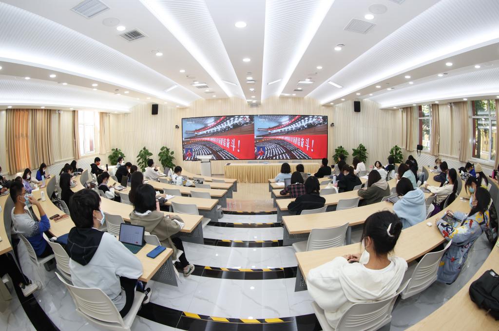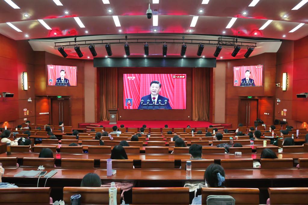 我校全体师生员工满怀激动而喜悦的心情关注大会盛况,分别通过线上线下多种形式收看开幕会直播。全体校领导和中层干部代表在综合楼909主会场收看开幕会,教师党员、学生党员、入党积极分子及团学骨干代表等近200人在逸夫报告厅和教二楼101教室分会场进行集中收看,大家倍受鼓舞,豪情溢满校园。