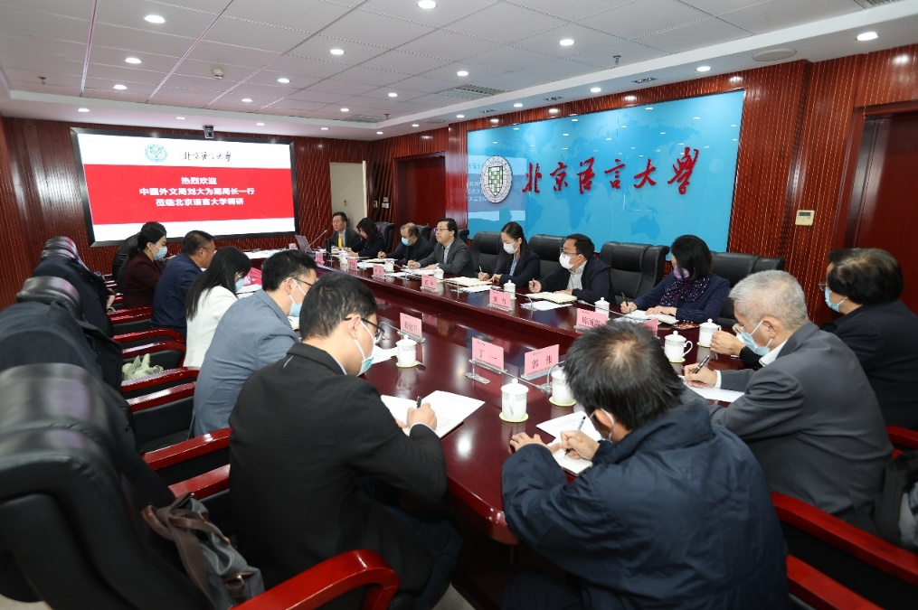 刘大为副局长首先对北京语言大学建校60周年表示热烈祝贺,对北京语言大学大力支持外文局开展各项合作表示衷心感谢。刘大为副局长介绍了此次调研的指导思想与主要目标。他指出,希望通过此次调研,深入了解基地建设的工作进展、存在哪些政策需求和困难、需要提供哪些支持和帮助,并希望进一步推进部校合作。