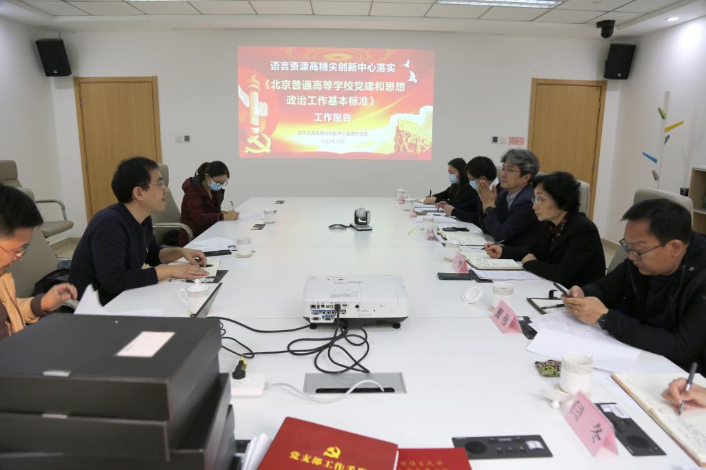 语言资源高精尖创新中心直属党支部副书记田列朋代表中心从党建工作与业务开展情况、取得的成效以及下一步的工作思考等方面作了汇报,重点结合本单位工作实际,对高水平党建引领中心高质量发展,服务国家战略、服务北京“四个中心”建设、服务学校发展等工作进行了详细汇报。评估组成员对中心的党建工作给予了肯定,认为报告全面、客观、真实地体现了中心的工作情况,并对汇报材料的逻辑结构、亮点特色、建设成效等提出修改建议,进行现场指导。