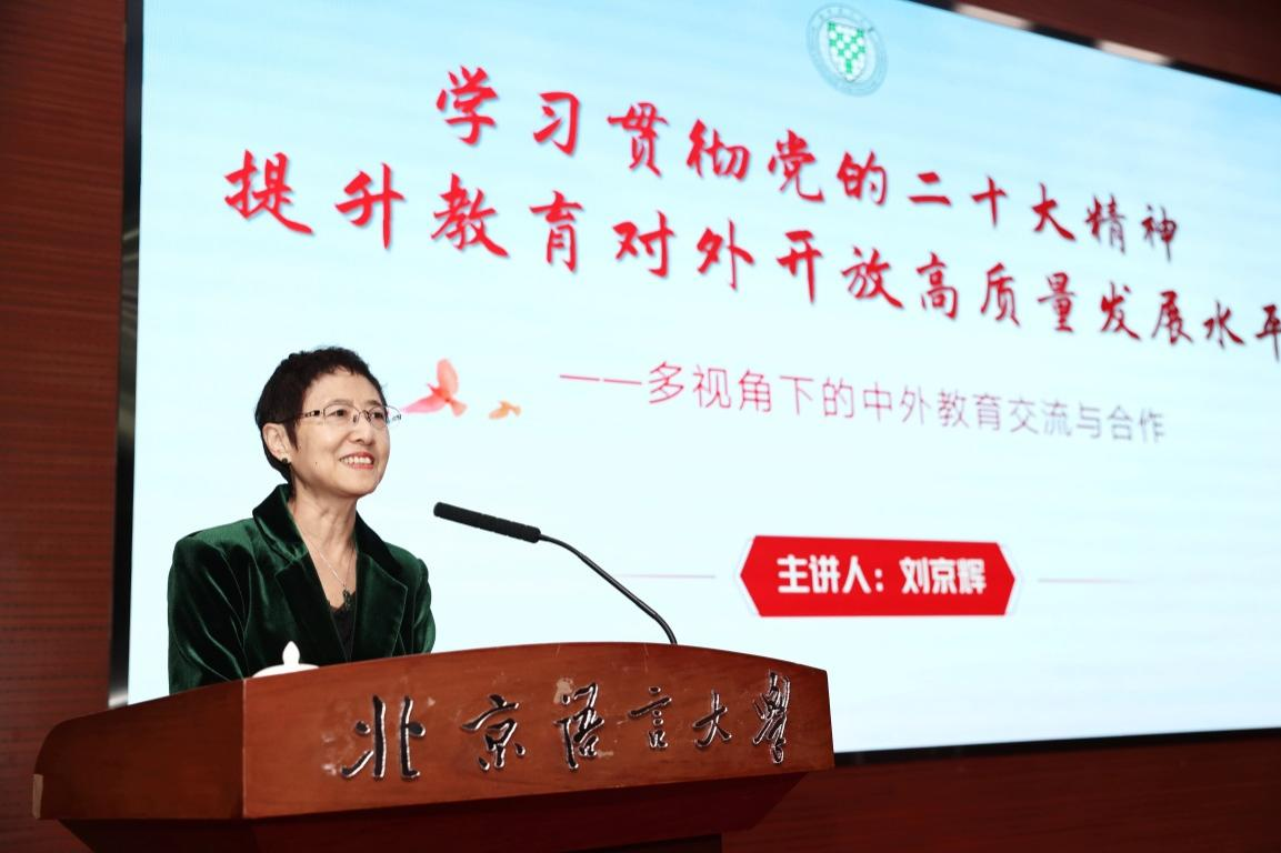 刘京辉理事长围绕教育对外开放高质量发展这一主题,结合党的二十大报告中坚持对外开放基本国策等重要论述,以目标导向、问题导向、策略导向为线索,从政治、社会、经济和教育四个视角切入,深入解读了我国打造教育对外开放新高地,为全球教育治理贡献中国方案的重要理念,系统阐释了习近平总书记“推进教育现代化,要坚持对外开放不动摇,加强同世界各国的互容、互鉴、互通”重要思想。此外,她还结合北京语言大学实际情况,详细阐述了新时代来华留学教育的意义、挑战和前景,以及讲好中国故事、做好对外传播的途径,勉励北京语言大学继续发挥特色优势,用教育传播中国故事,让世界了解开放自信的中国,为打造人类命运共同体贡献自己的力量,并对学校未来教育对外开放高质量发展方向提出具体建议。报告结束后,刘京辉理事长还与领航班学员们进行了交流互动,对大家提出的问题给予了耐心细致的解答。学员们表示,通过这次报告会,大家对教育开放国策有了更为全面深入的理解,也对学校未来事业发展有了更加坚定的信心。