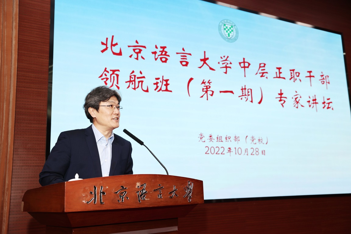10月28日下午,北语中层正职干部领航班(第一期)专家讲坛第二讲在逸夫报告厅举行。中国高等教育学会常务理事、外国留学生教育管理分会理事长、原国家留学基金管理委员会秘书长刘京辉同志应邀来校作辅导报告,题目为《学习贯彻二十大精神,提升教育对外开放高质量发展水平——多视角下的中外教育交流与合作》。参加报告会的有校领导、中层干部、教职工党员代表。报告会由副校长张宝钧同志主持。