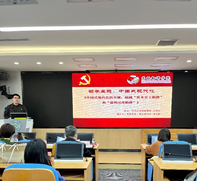 接下来,刘文韬同志领学了由中共中央党校吴忠民教授撰写的《中国式现代化的关键:超越“资本至上陷阱”和“福利过度陷阱”》。他提到,要正确认识中国式现代化与西方现代化的区别,正确看待中国式现代化面临的挑战,增强道路自信。