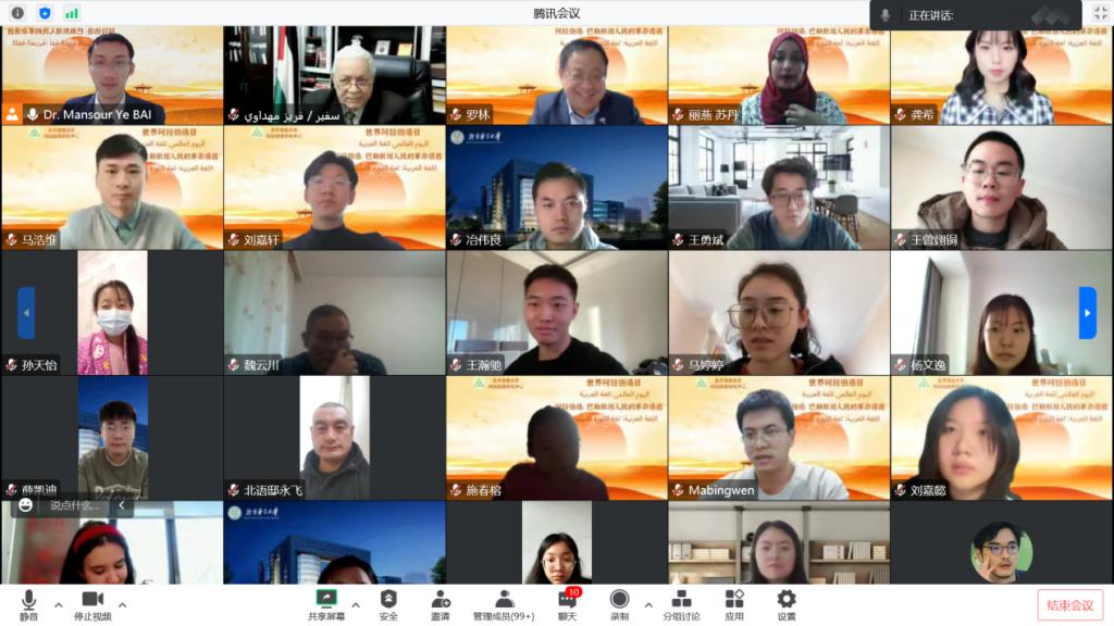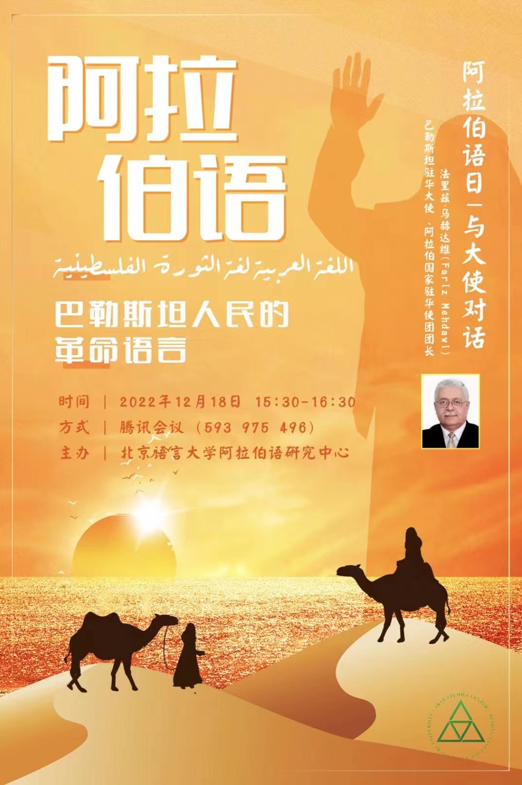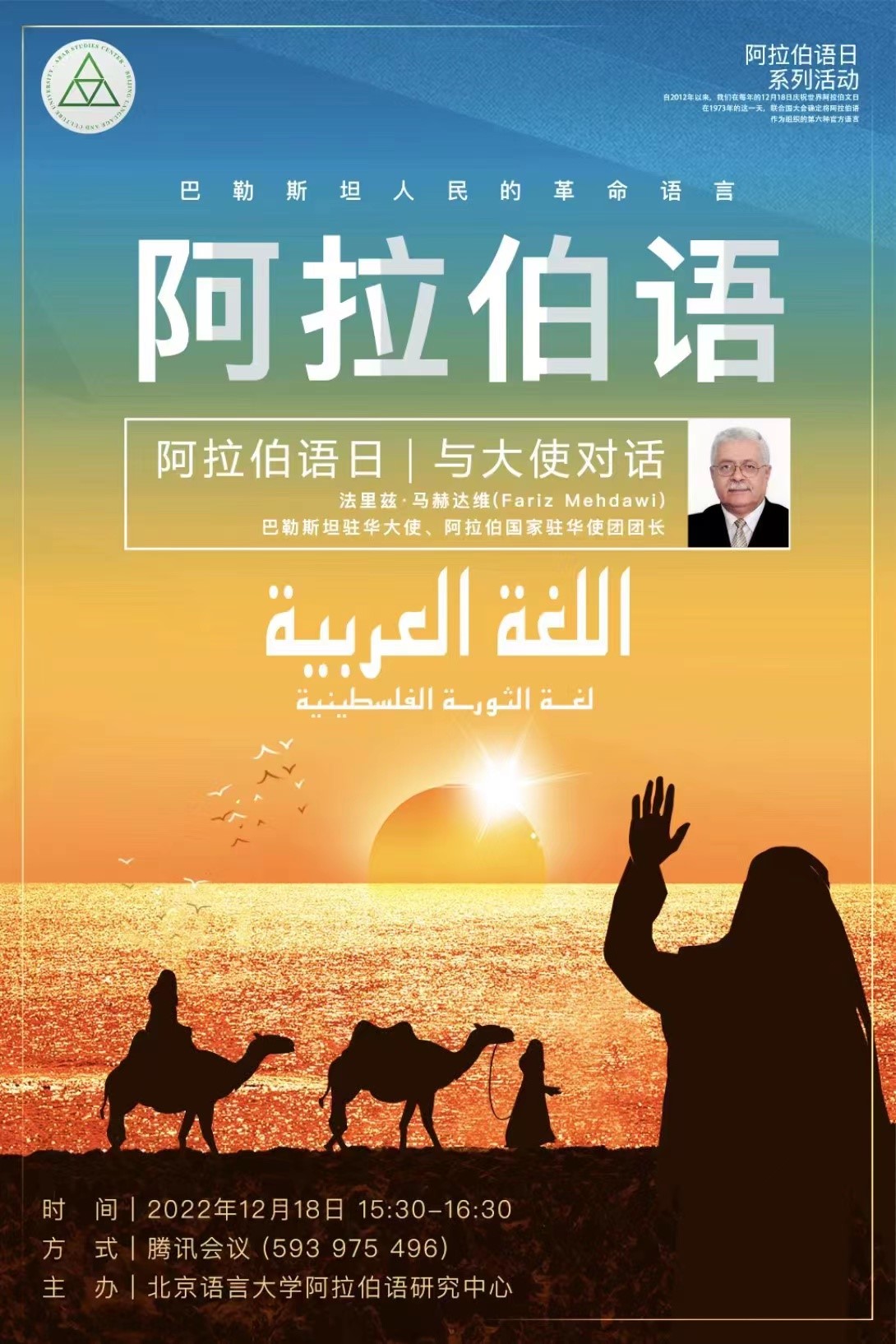 12月18日我校阿拉伯研究中心举办了主题为“阿拉伯语:巴勒斯坦人民的革命语言”世界阿拉伯语日线上纪念活动,中心特邀阿拉伯国家驻华使团长、巴勒斯坦国驻华大使法里兹·马哈达维(Feriz Mahdawi)博士为我校中东学院阿拉伯语系全体教师做了主题演讲。