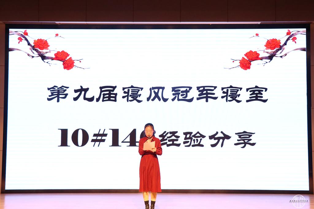 前五组寝室表演完成后,第九届公寓文化节冠军学10楼146寝室代表上台分享了去年寝风大赛中的经历和心得。她回顾了参与寝风大赛的心路历程,希望同学们珍惜寝室的友谊、建设和谐寝室,并预祝寝风决赛圆满成功。