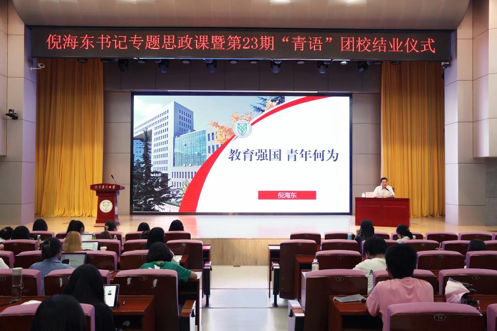 为学习宣传贯彻党的二十大精神,推进学习贯彻习近平新时代中国特色社会主义思想主题教育走深走实,6月15日,倪海东书记专题思政课暨第23期“青语”团校结业仪式于教一楼209报告厅顺利举行。