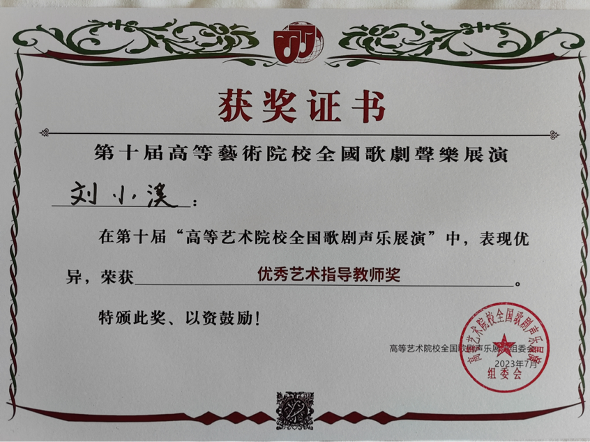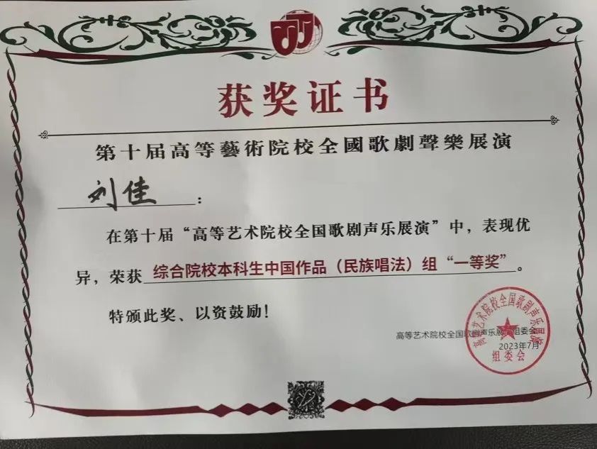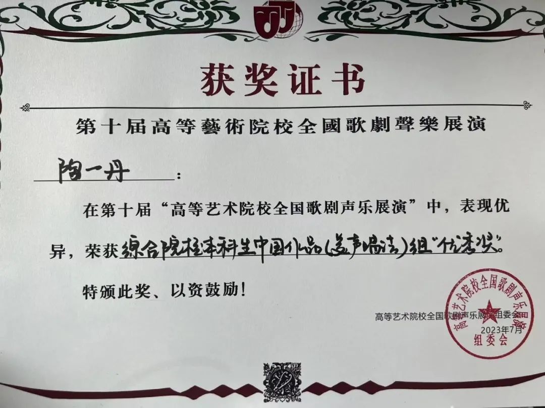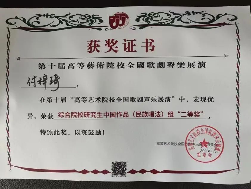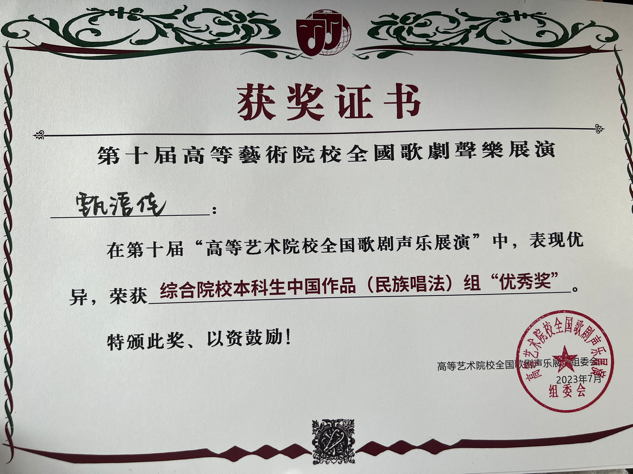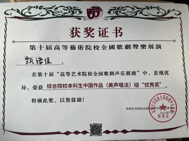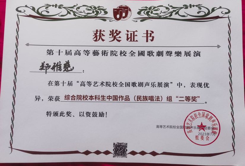 经过四天激烈角逐,参赛选手们发挥出色,最终共有5名学生晋级决赛并获得佳绩,刘佳同学演唱的《就在山水间》荣获综合院校本科生民族唱法一等奖,郑雅慈同学演唱的《敕勒歌》获得综合院校本科生民族唱法二等奖,付梓琦同学演唱的《五州人民齐欢笑》获得综合院校研究生民族唱法二等奖,陶一丹、甄语佳两位同学获得综合院校本科生美声组优秀奖。陈霞教授荣获优秀指导教师奖,刘小溪老师荣获优秀艺术指导教师奖。