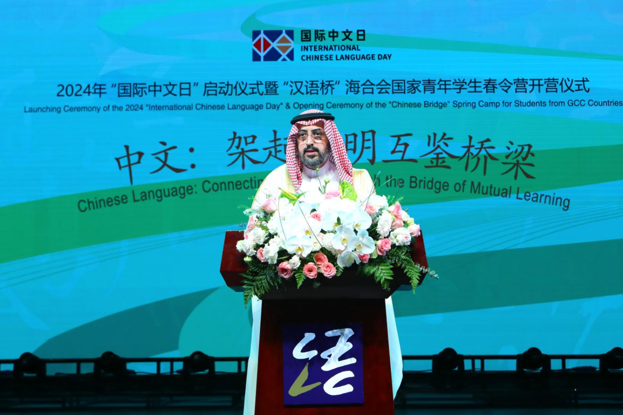 沙特阿拉伯王国驻华大使阿卜杜拉赫曼·哈勒比在国际中文启动仪式上致辞回溯了沙特与中国交往的历史,600年前郑和就带着自己的船队到达了阿拉伯湾、到达了阿拉伯地区和红海周边,还有麦加和其他的地方来传播友谊,加强双方之间经济、文化的往来。郑和这次旅行依然被人们津津乐道直到今天,而今天沙中之间的友谊又得到了不断的发展并且日趋繁荣,建立了更加全面的战略合作关系,这也是2030愿景和中国的一带一路相互交织的结果。他表示在阿拉伯语使用的范围中,大概有6亿人使用阿拉伯语作为自己的母语,所以其认为在阿拉伯世界教授中文是一个非常重要的举措,它的重要性不亚于教授阿拉伯语,所以沙特的教育部就决定把中文教学、把中文教程作为一个贯穿国民教育体制最重要的一个决定,我们认为教授中文和阿拉伯语是最重要的一个举措,在这样一个框架范围之内,同时这也是沙中两国交流最重要的一个载体,而今年我们有更多的学校已经被列入了中文教学的大名单,并且我们准备派遣更多的学生和老师来到中国进行中文学习,同时我们还准备在沙特把中文作为一个必修语言之一进行进一步的加强,来进一步用中文吸引更多的游客来发展沙特的旅游业。