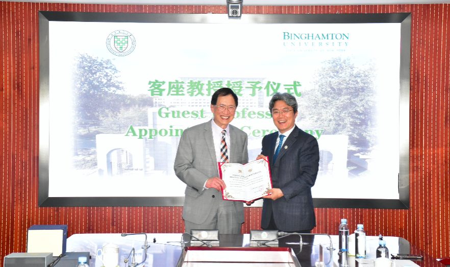 随后举行了我校高翻学院聘任陈祖言教授为客座教授的仪式。外国语学部副主任穆扬(主持工作)宣读了陈祖言博士简历,张宝钧副校长向陈祖言博士授予聘书。陈祖言教授在发言中对北语及高翻学院表达了对受聘的荣幸与感激之情,表示这是他学术和教职生涯的又一个崭新的起点。他将全力以赴为北语的发展贡献力量,与师生们分享最新的学术成果与实践经验,继续推动北语和宾汉顿之间的深度合作。