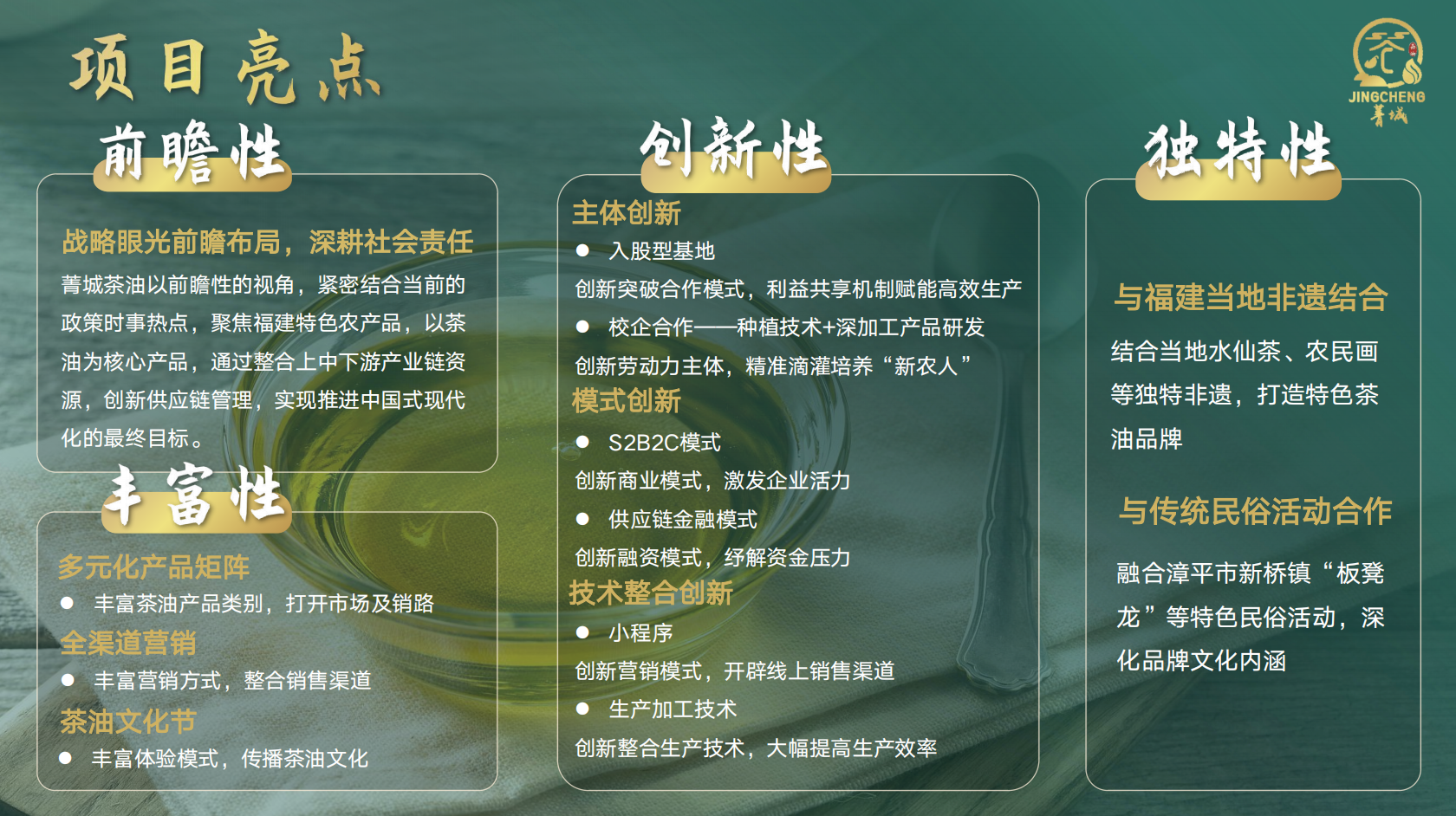 项目的成功离不开指导教师校团委邹泺铱老师、商学院张政老师的悉心指导,以及团队成员陈静一、任卓然、申欣怡、王伊芸、邓琳、王贝琪等同学的共同努力。在加快推进农业强国建设、构建现代农业发展体系、推进新质生产力发展的时代背景下,菁城茶油团队结合福建漳平丰富的油茶资源,选取绿色天然、营养健康的茶油作为主要产品,充分整合资源,发挥团队专业优势,从新质生产力各个角度切入,围绕劳动资料的“新”、劳动方式的“新”、劳动者的“新”,积极迎合农业科技的发展浪潮,创新应用基于供应链全流程的S2B2C新型商业模式,革新了茶油产业上中下游间一贯较为松散分离的供应链管理,助力实现福建茶油高质量转型发展。团队成员以青创报国践行青春梦想,以实际行动诠释时代担当,用“菁城所至,茶油香来”引领开路,做好家乡土特产文章,勇当新时代的新农人,携手书写青春为中国式现代化挺膺担当新篇章。