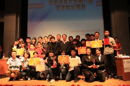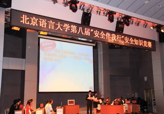 11月30日下午,由保卫处主办、大学生治保会承办的北京语言大学第八届“安全伴我行”知识竞赛在主楼209综合厅隆重举行。董立均副校长非常重视此次比赛的举行,预祝本次活动圆满成功。我校保卫处、校团委、后勤服务集团、幼儿园、饮食服务中心、物业服务中心、315中心、国际商学院副、外国语学院等单位的相关负责人及各院辅导员老师等出席此次活动。