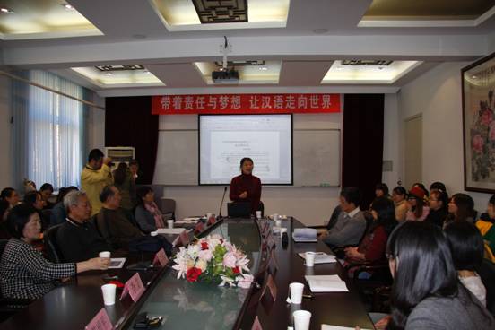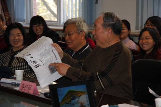 离退休处总支书记、关工委副秘书长袁丹、专职委员李忆民教授、谢业顺教授、李杨教授、李艾教授、陈世平老师与人文学院的部分青年教师和30多名对汉语专业的研究生欢聚一堂,共同畅谈各自学习和从事对外汉语教学的体会、经历,抒发让汉语走向世界的美好愿望。人文学院总支书记程娟教授到会并致欢迎词。