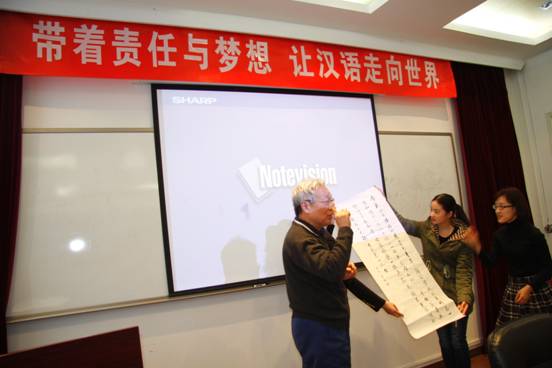分享完老教授富有激情的演讲,同学们踊跃地发表自己的感言,表达感谢之余,并就海外汉语教师如何应对国际争端和热点问题的困扰对外汉语学生如何才能做一名合格的汉语国际教育海外志愿者、作为对外汉语专业的研究生该如何做好毕业论文的选题和科研立项等。在场的老中青三代对外汉语教师为学生的提问一一作答。谢业顺教授代表校关工委向同学们赠送了自己亲自撰写的写画,以“学校的目标始终应当是青年离开学校时是作为一个和谐的人,而不是作为一个专家。为和谐之人,才能载着无限的梦想和希望,像条龙一样飞翔,为国家和民族拼搏奉献,为自己铸造美丽的人生”的真诚寄语,赋予青年之厚望。最后关工委委员和人文学院研究生会、团支部互赠礼物,并合影留念。