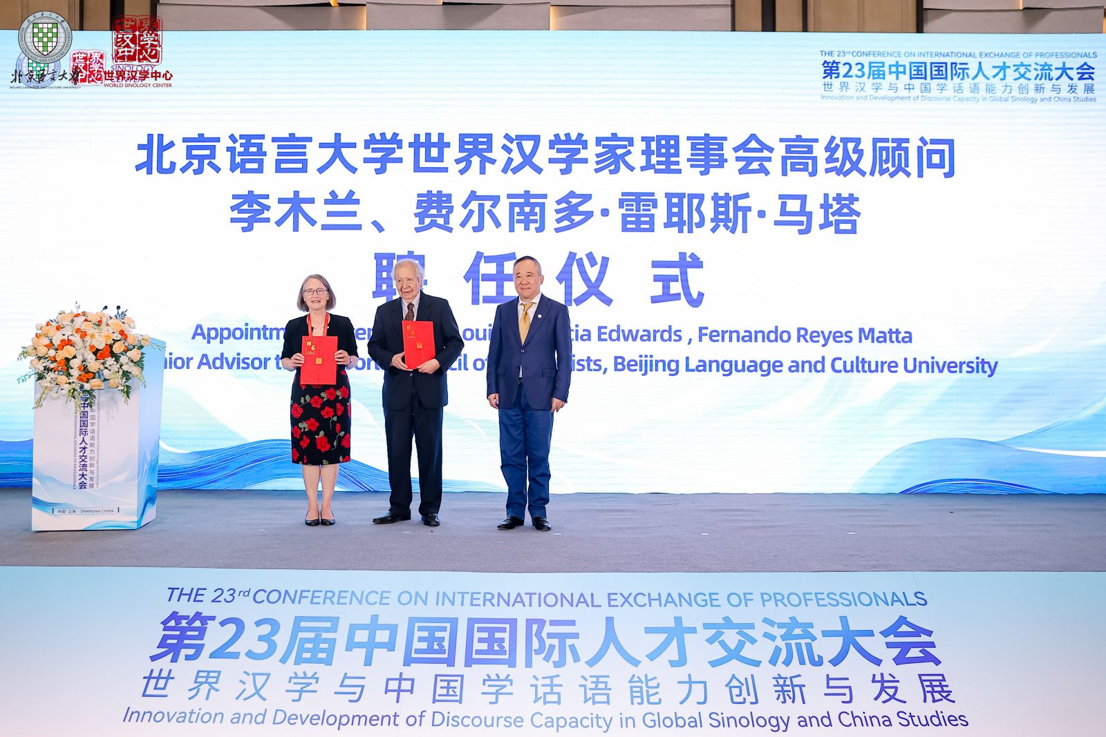 开幕式还举行了世界汉学家理事会顾问委员会增聘仪式,聘任澳大利亚新南威尔士大学荣休教授、澳大利亚社会科学院院士李木兰,安德烈斯·贝略大学拉美中国问题研究中心主任、智利前驻华大使费尔南多·雷耶斯·马塔受聘为“北京语言大学世界汉学家理事会高级顾问”。世界汉学家理事会顾问委员会由来自全球多个国家和地区的数位在世界范围享有盛誉的汉学家组成,旨在为世界汉学家理事会的国际化发展提供战略指导,为世界汉学与中国学学科体系建设发展提供前瞻性、学术性指导建议。