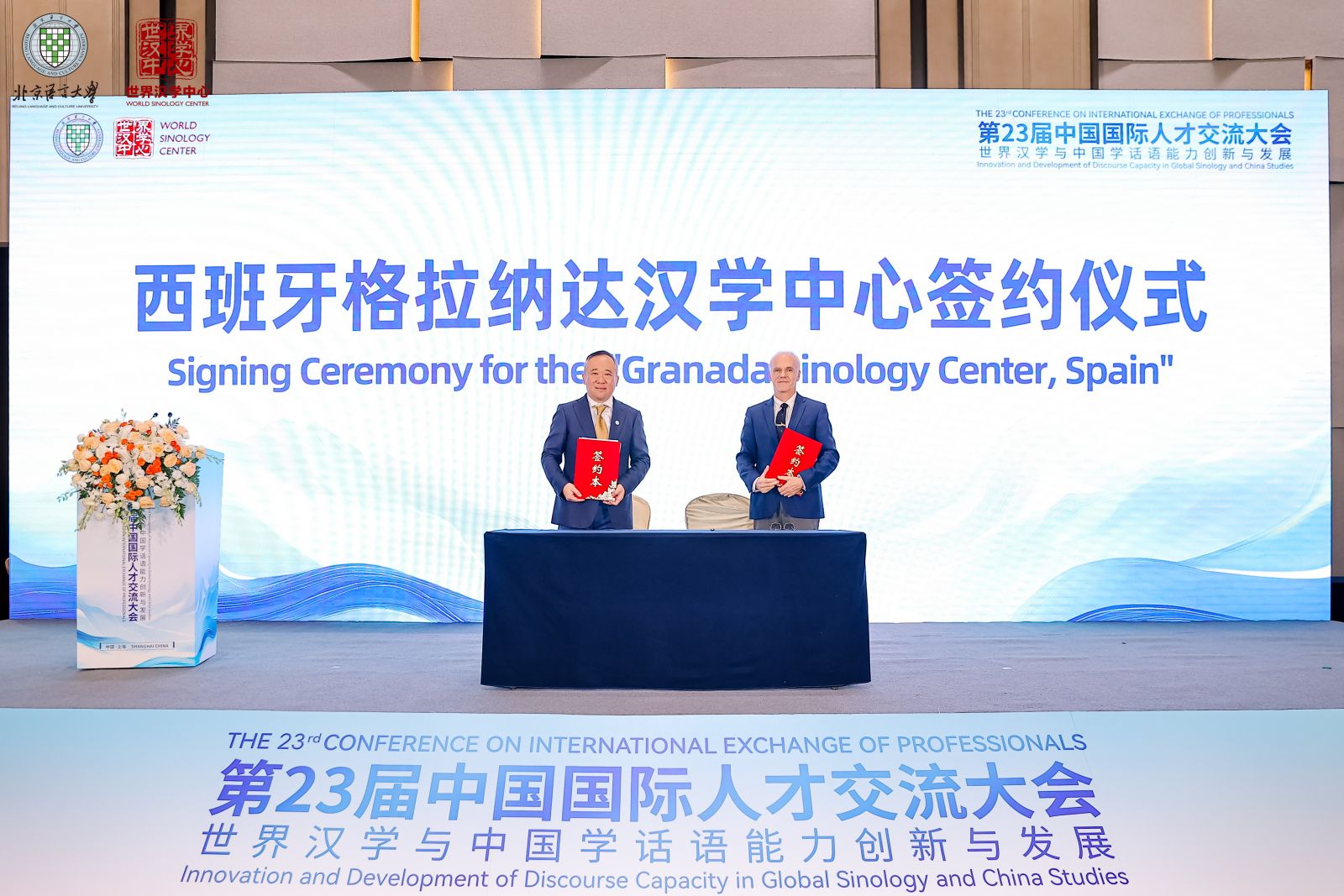 段鹏校长与西班牙格拉纳达大学翻译和口译学院终身教授高伯译分别代表两校签署共同建设西班牙格拉纳达汉学中心合作协议。格拉纳达汉学中心将衔接传统传教士汉学与当代中国特色鲜明的中国学研究,打通汉学研究的历史脉络与当代视野,为梳理汉学发展的全球谱系提供重要支撑。