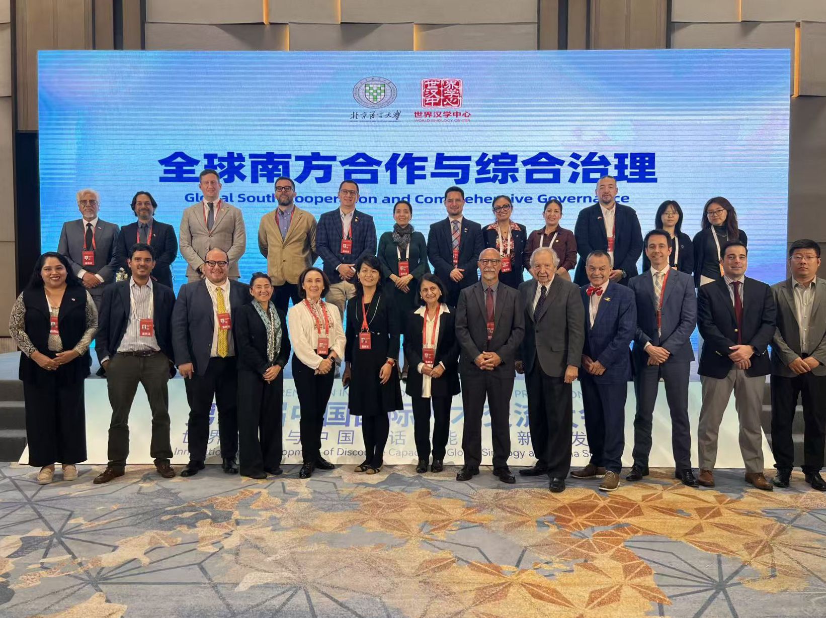 北京语言大学校长段鹏,厄瓜多尔皮钦查省省长保拉·帕邦,美国东北州立大学校长罗德尼·汉利,澳大利亚新南威尔士大学荣休教授、澳大利亚社会科学院院士李木兰,加州大学伯克利分校荣休教授、美中关系全国委员会公共知识分子项目顾问高棣民,安德烈斯·贝略大学拉美中国问题研究中心主任、智利前驻华大使费尔南多·雷耶斯·马塔,欧洲科学与艺术学院院士吴漠汀,我校人事处、国际学生处、发展规划与学科建设办公室等职能部门负责同志,以及来自全球47个国家和地区的100余位汉学家、中国研究专家、高校代表出席分会场开幕式,我校世界汉学中心主任、汉学与中国学学院(一带一路研究院)院长徐宝锋主持活动。