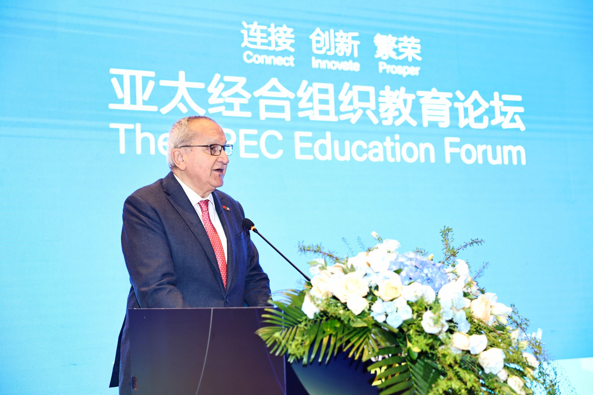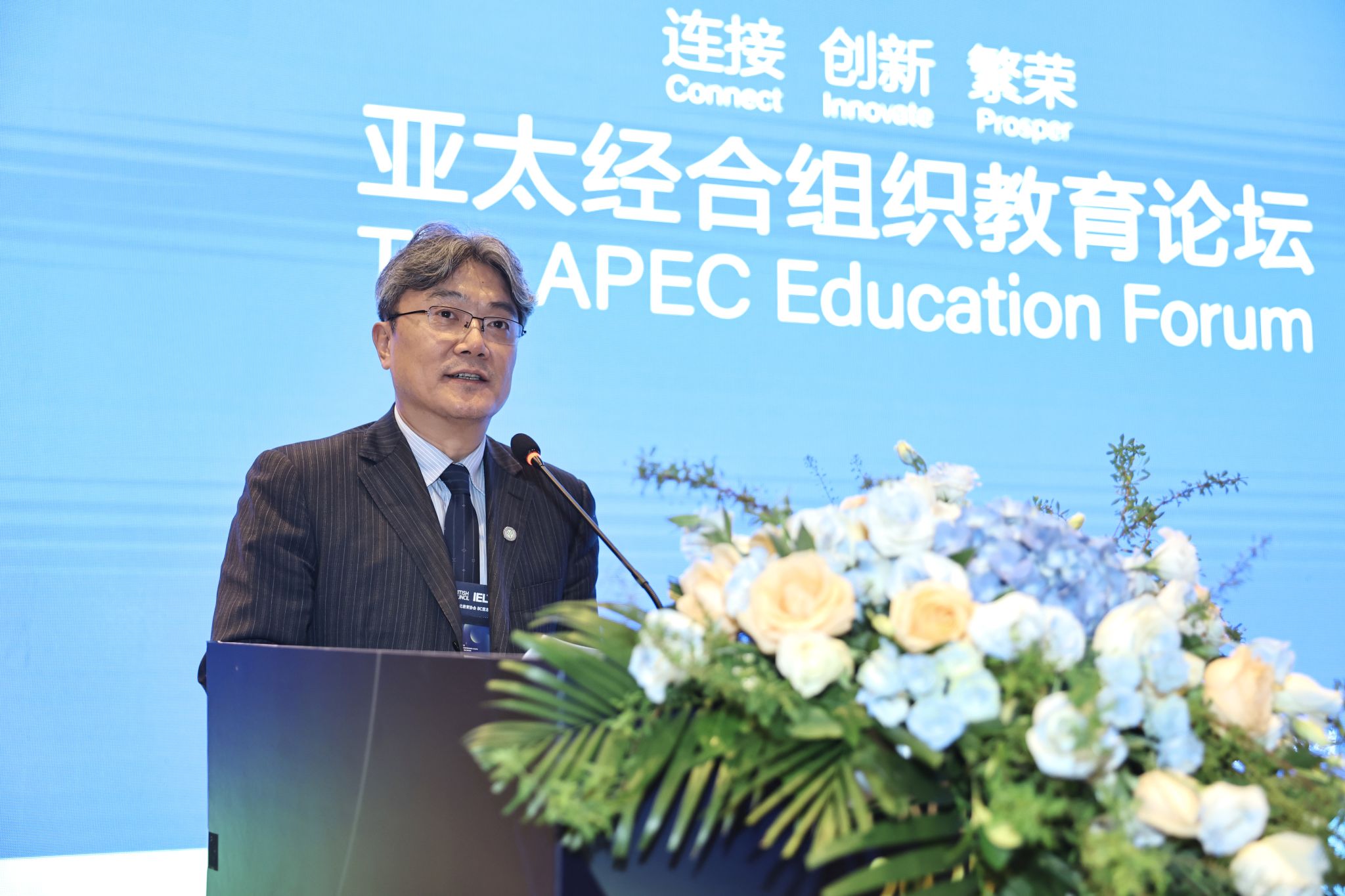 北京语言大学党委书记倪海东在致辞中表示,面对百年未有之大变局,教育正在成为决定未来全球格局的新力量。各个经济体需重新审视教育的使命与价值,深刻理解其在时代进程中的作用。他进一步提出四点主张:一是教育发展是应对全球变局的关键力量,教育不再只是培养个体的途径,而是塑造未来社会与文明的重要支柱;二是亚太合作应成为全球教育发展的方向,以建成更加均衡、更加包容、更加多元的教育互联互通新生态;三是语言文化是多元文明互鉴的基石,通过语言教育推动与人文精神、科技创新的深度融合;四是青年应成为推动和平与发展的主体力量,让青年具备跨文化理解、数字素养和人类关怀的能力。未来,北京语言大学将继续发挥在语言文化与国际教育方面的优势,与亚太各界携手,以连接促进理解与信任、以创新激发教育高质量发展动力、以合作实现人类发展共同愿景,助力书写亚太共荣共兴的新篇章。
